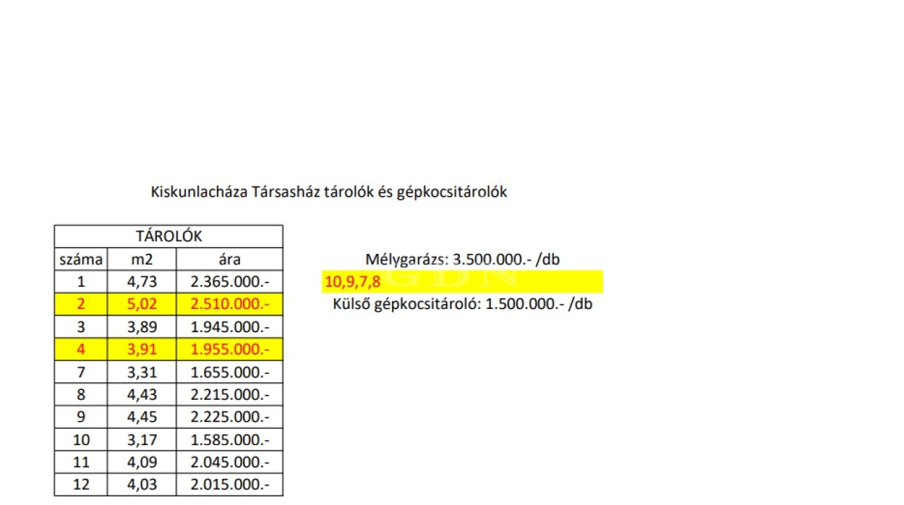 A lakáshoz vásárolható teremgarázshely melynek ára 3.500.000 ft, vagy földfelszíni parkolóhely melynek ára 1.500.000 ft, (megvásárlása nem kötelező), valamint tároló helyiség is vásárolható.