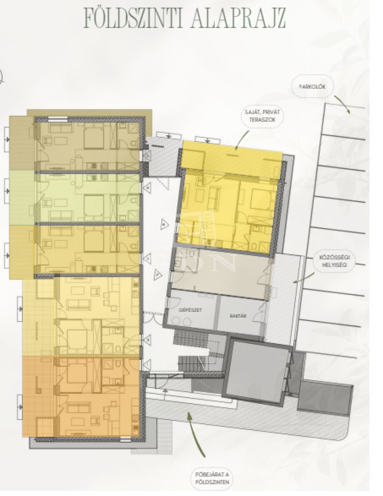 A 3 szintes lakóépület földszintjén, illetve első és második emeletén további lakások helyezkednek el, ezek 29, 39, 30, 40 és 46 m2 alapterületűek.