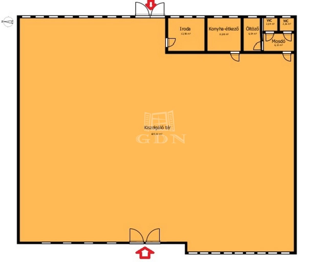 -a belső térben egy iroda, irattár, teakonyha, öltöző, 2 db mosdó-wc található