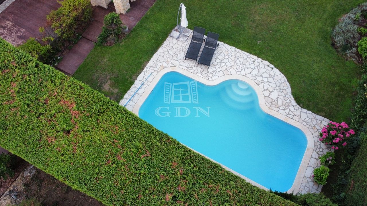 A házba a nagy méretű teraszon keresztül érkezünk, amellyel szemben egy polipropilén 8*3,5 m nagyságú, beépített medence helyezkedik el, melyhez gázfűtésű rendszer került kialakításra.