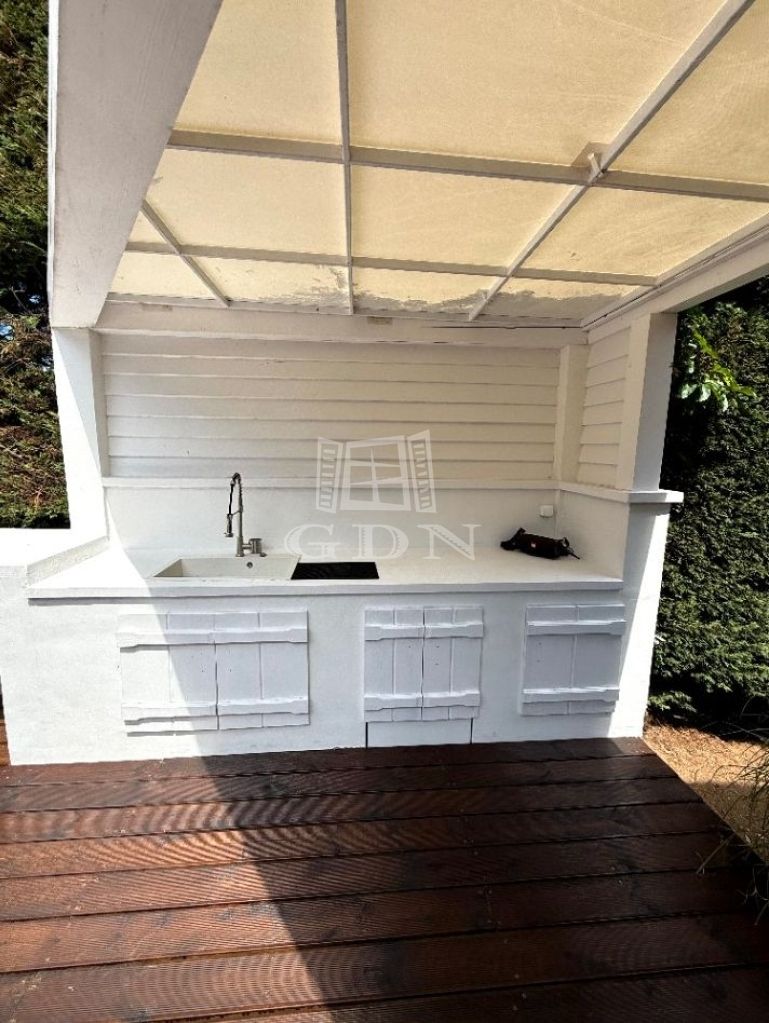 A kültéri grill sarok nyári konyhával került kiegészítésre, biztosítva a kertben töltött idő teljességét.