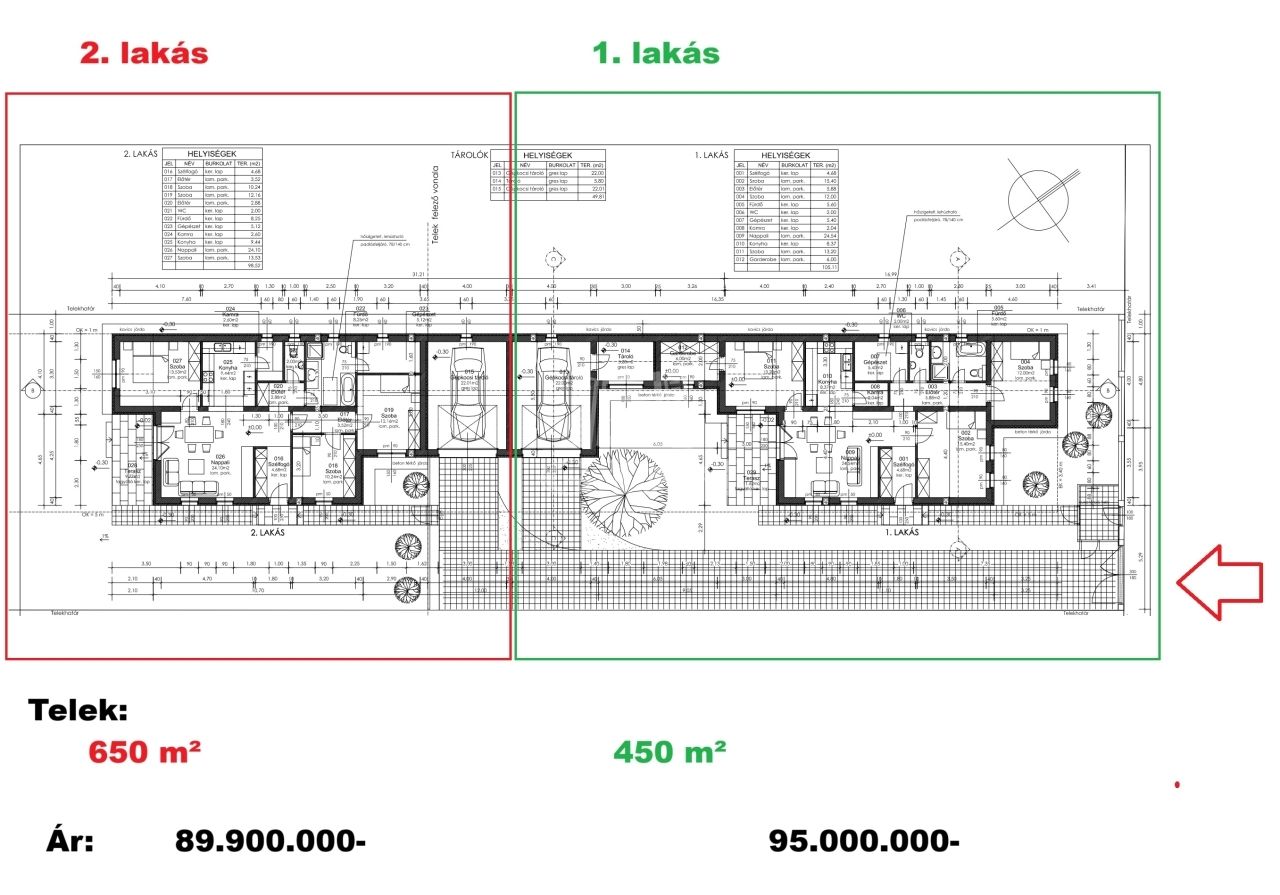 Az ingatlanok 650 m2-es és 450 m2-es TELKEN helyezkednek el, EGYSZINTES elrendezéssel (NETTÓ 105,11 m² és 98,52 m² lakóterület). Az AMERIKAI KONYHÁS NAPPALI mellett 3 különálló szoba található.