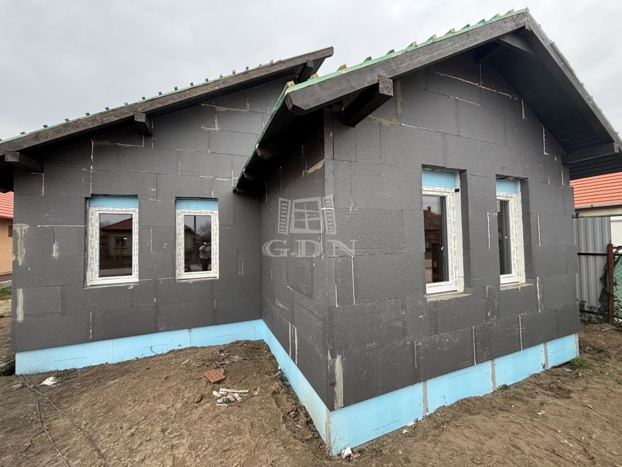 • Homlokzati szigetelés: 10 cm grafit EPS homlokzati hőszigetelő lemez (pl. Austroherm Grafit), padozat alatt 12 cm vtg hőszigetelés (pl. Austrotherm AT-N-100