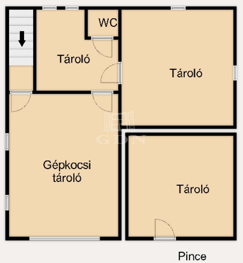 A pinceszint 65 nm területű, 20 nm-es, motoros kapus garázsból, két tárolóhelyiségből és egy külön kézmosós WC-ből áll. Az udvaron további egy autó számára biztosított beállási lehetőség is adott.