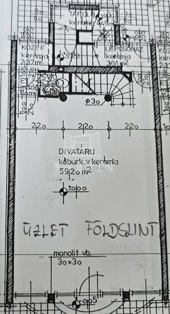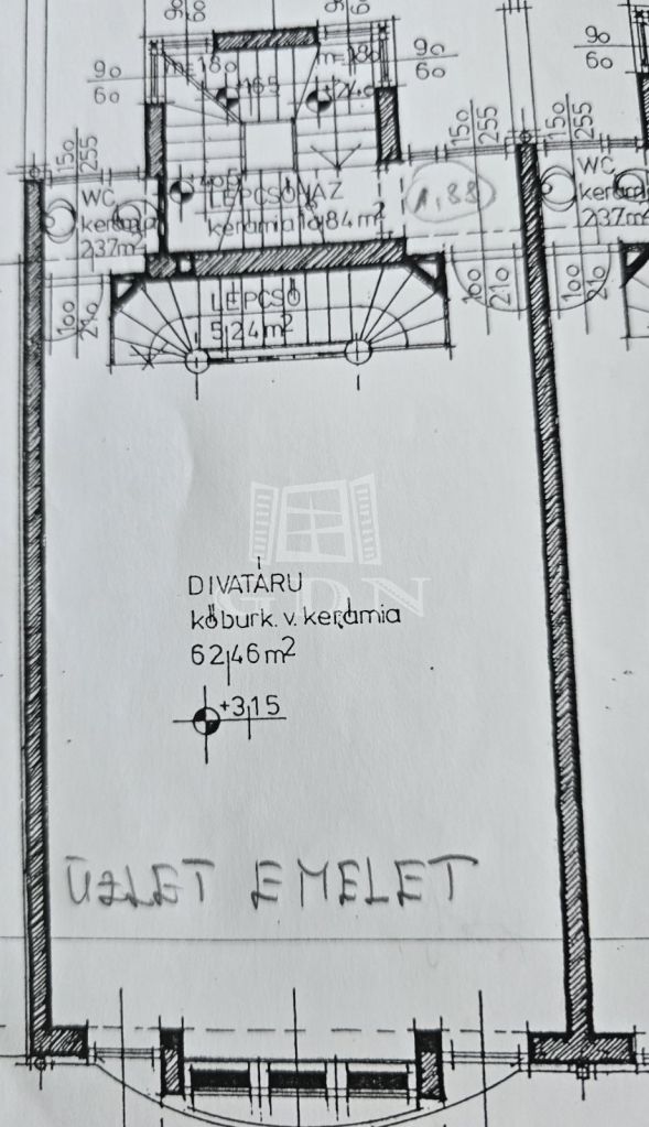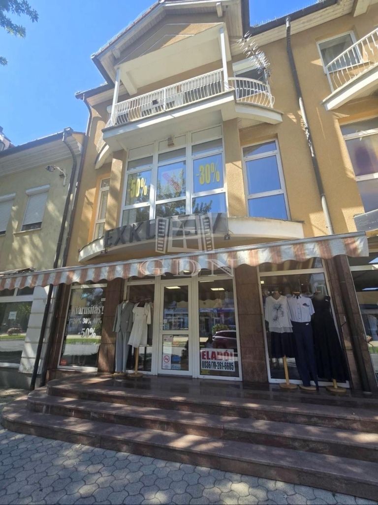 Alapterület és elrendezés: kétszintes üzlethelyiség; a földszinten 59 m² üzlettér + WC és két tároló; az emeleten 62 m² üzlettér, wc és tároló