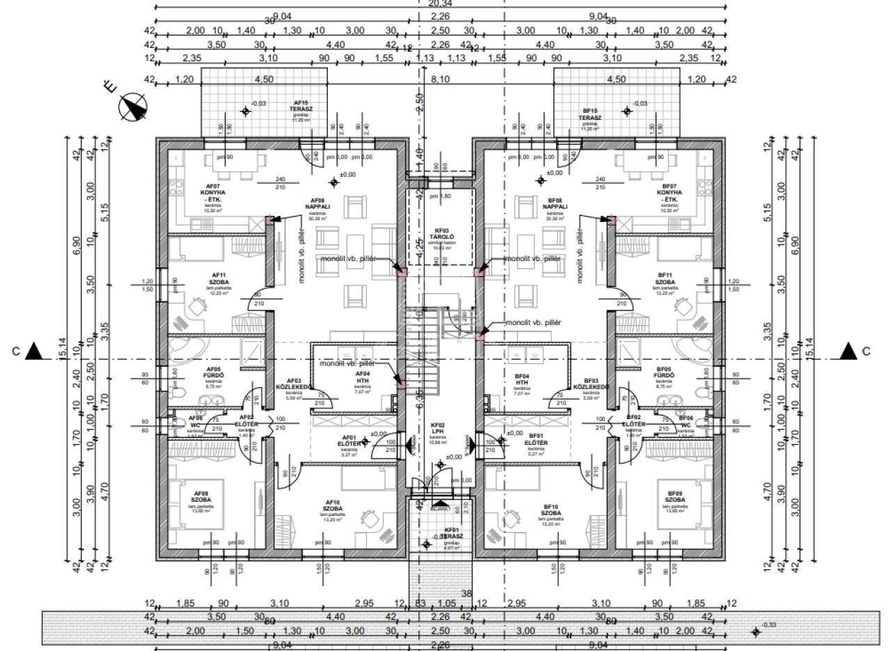 Az épület beton alapra, 30-as síkra csiszolt tégla falazattal, monolit beton födémmel, beton cserép fedéssel épül meg.