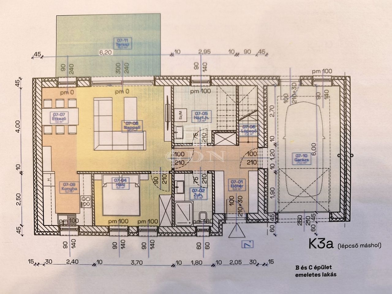 kertrész kb. 200 nm. A garázs teteje monolit födém, járható,