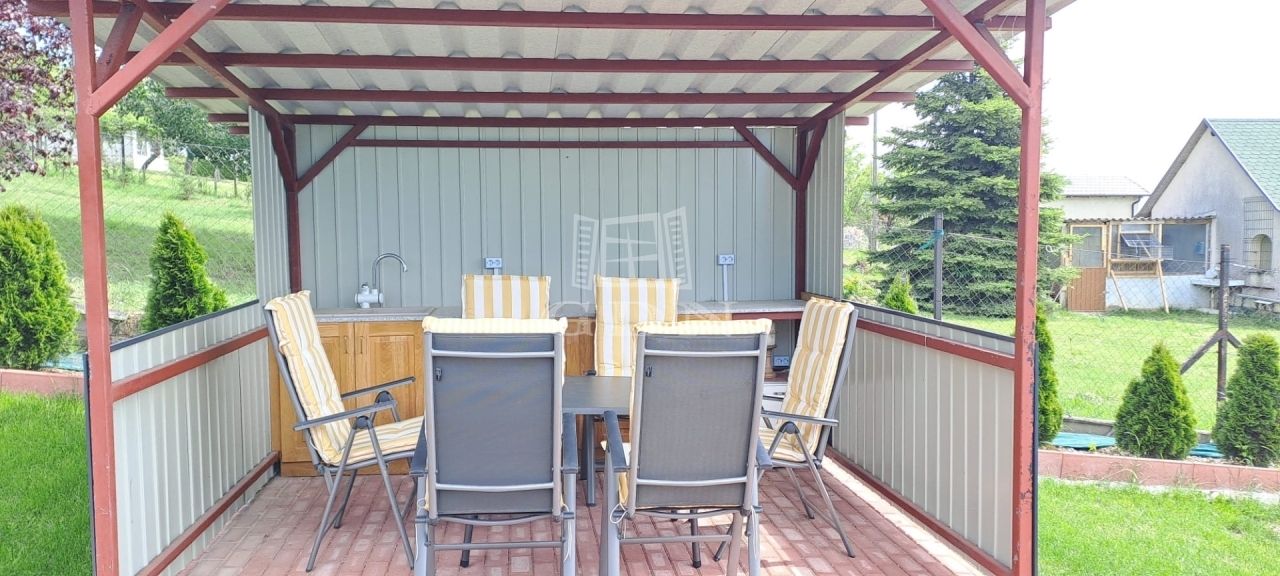 A telek 800m2, teljesen körbekerített, nagy része térkövezett és örökzöldekkel beültetett. Pergolás kültéri konyha áll rendelkezésre a kerti élményekhez.