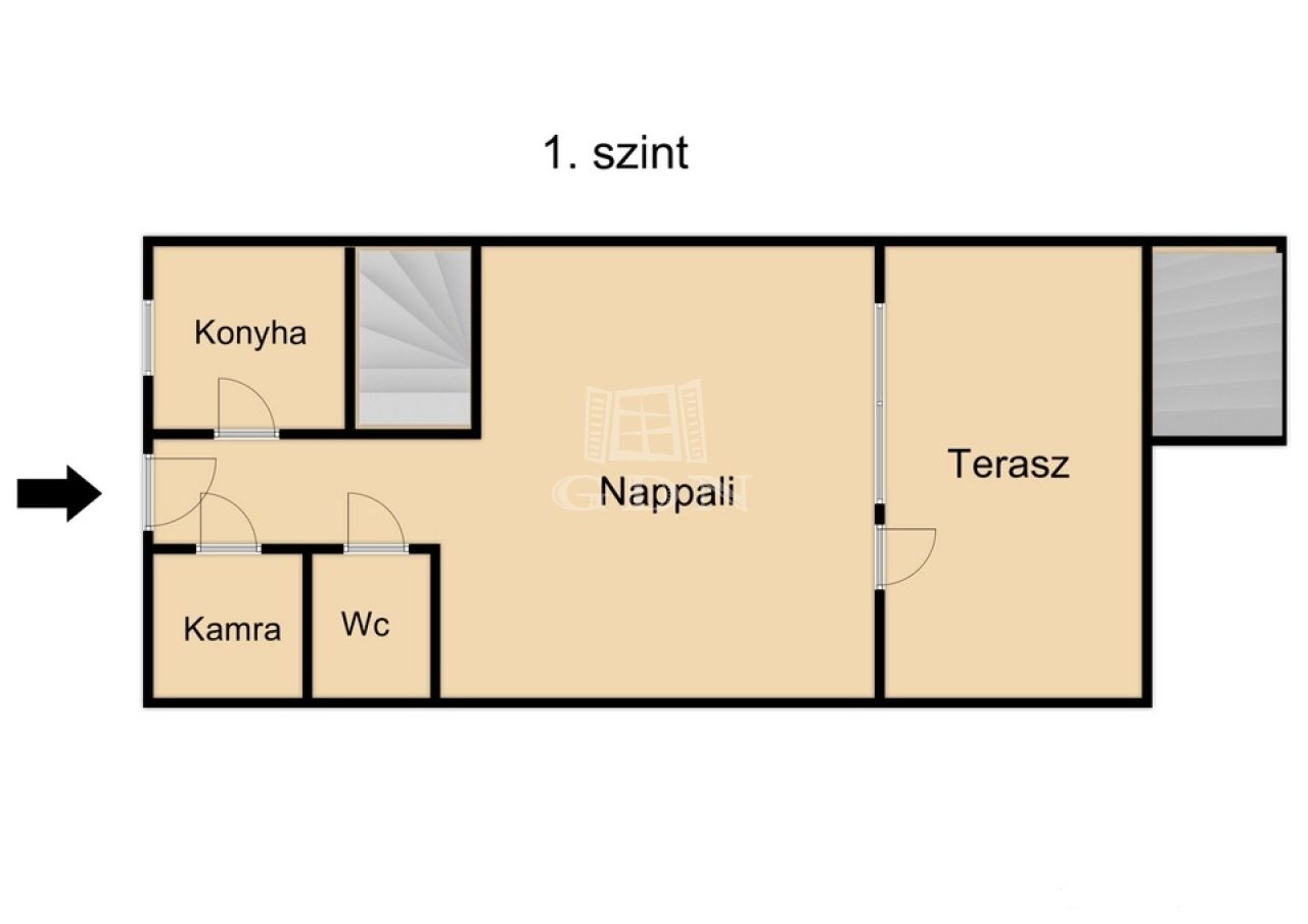 Földszint: nappali, konyha, étkező, külön WC, közvetlen kert- és teraszkapcsolat