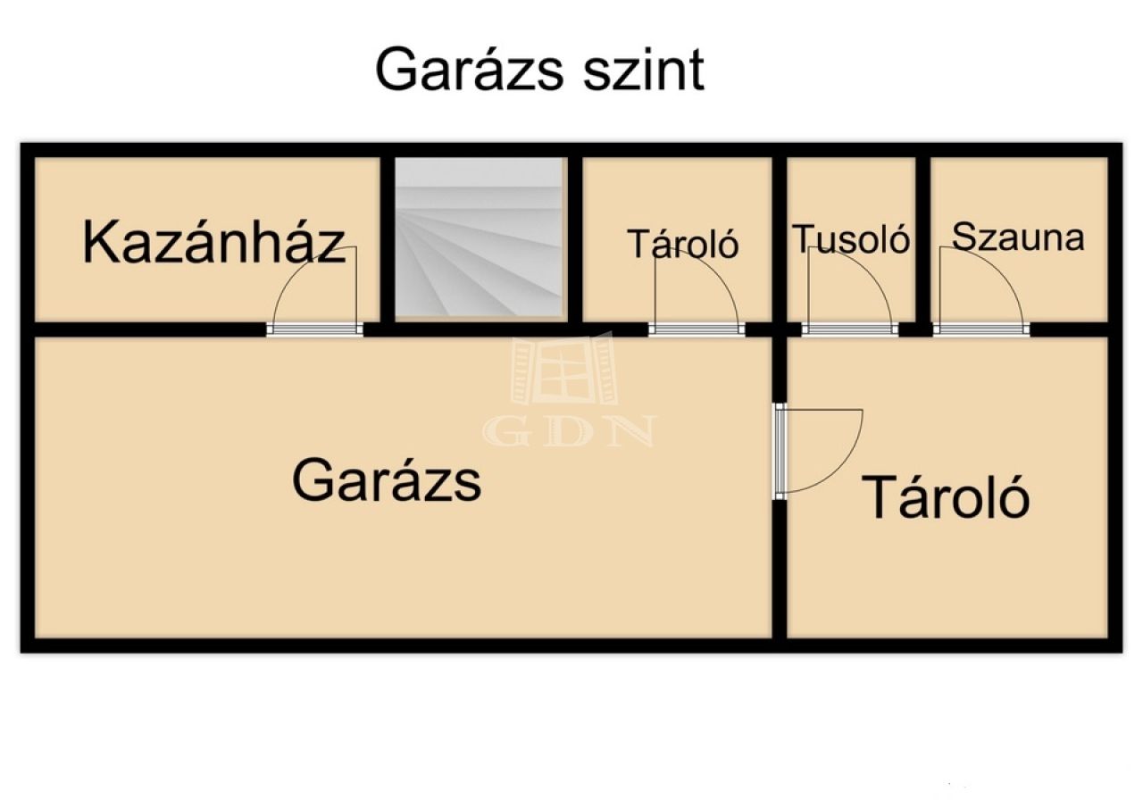 Alsó szint: 50 m²-es garázs, két külön helyiség, szauna, zuhanyzó