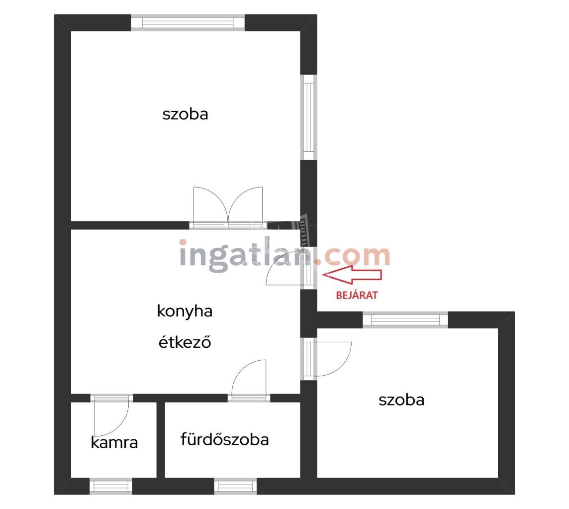 - a 250 m2-es telken elhelyezkedő, vegyes falazatú ház áll egy nagyobb, valamint egy kisebb szobából, egy étkezővel egy légtérben található konyhából, kamrából valamint egy fürdőszobából (WC-vel egy helyiségben)
