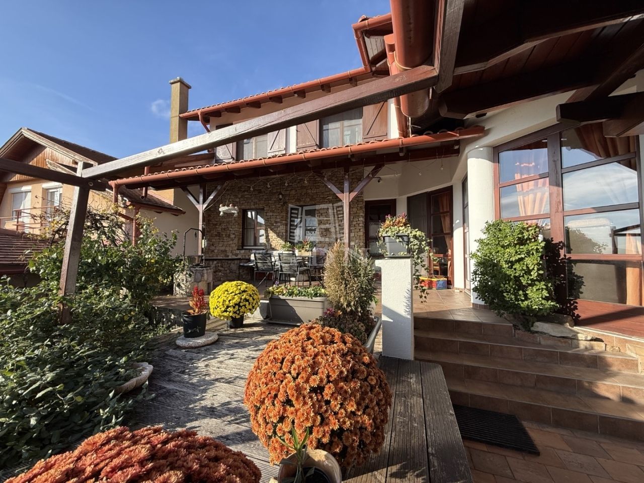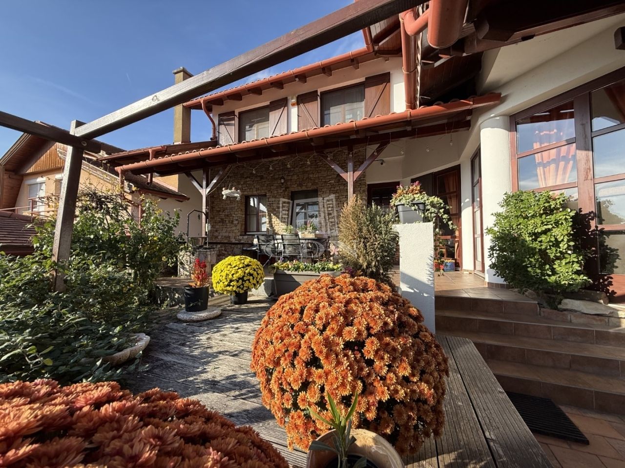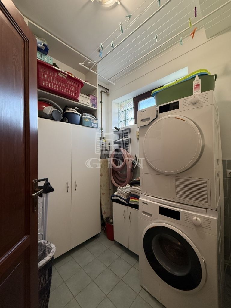 - Itt található egy tágas világos, amerikai konyhás nappali-étkező, olyan különleges megoldással mint a konyhában lévő kemence, kamra, vendég-WC, előszoba, közlekedő, háztartási helyiség. A nappaliból közvetlen kijárat nyílik a teraszra (25m2).