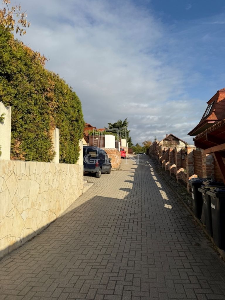 Az összesen 3047 m²-es telek teljes egészében körbekerített, gondosan karbantartott és rendezett. A ház egy 4-es sorház középső lakása. Bejárás elektromos kapun keresztül, közös térkövezett behajtón történik. A gépkocsibeállás térkővel burkolt fedett területen megoldott minden ház saját területén.
