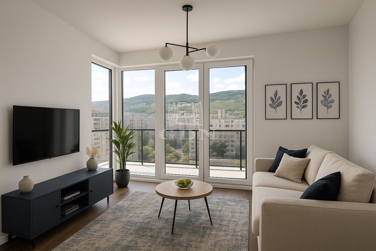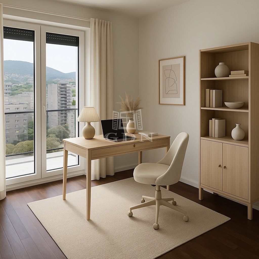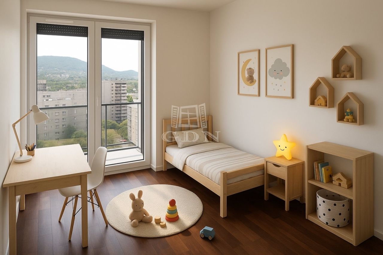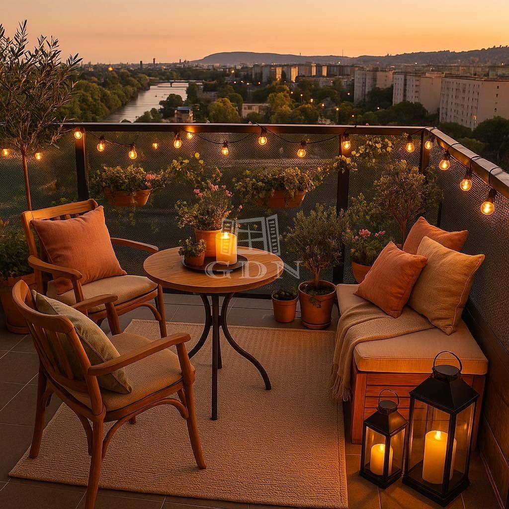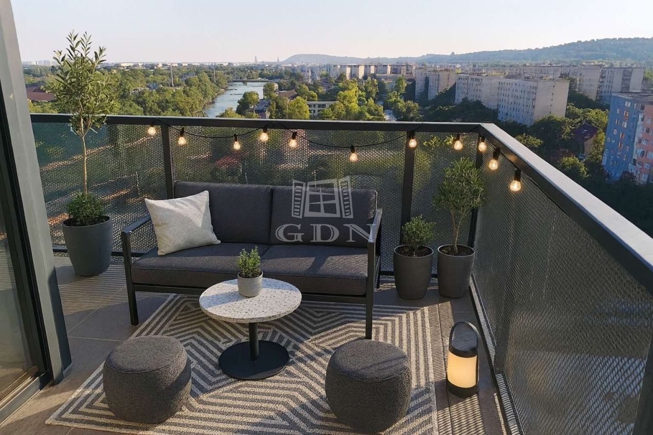 A 18 m²-es, panorámás erkély közvetlenül megközelíthető a nappaliból és mindkét hálószobából – ideális helyszín a reggeli kávéhoz, naplementéhez vagy egy esti borozáshoz a város fényeiben gyönyörködve.