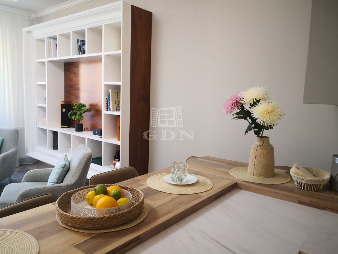 A légkondicionált, modern, gépesített amerikai konyhás nappalival és beépített bútorokkal stílusosan kialakított lakásban három plusz egy fél szoba, két fürdőszoba az egyik WC-vel, továbbá egy különálló mellékhelyiség található.
