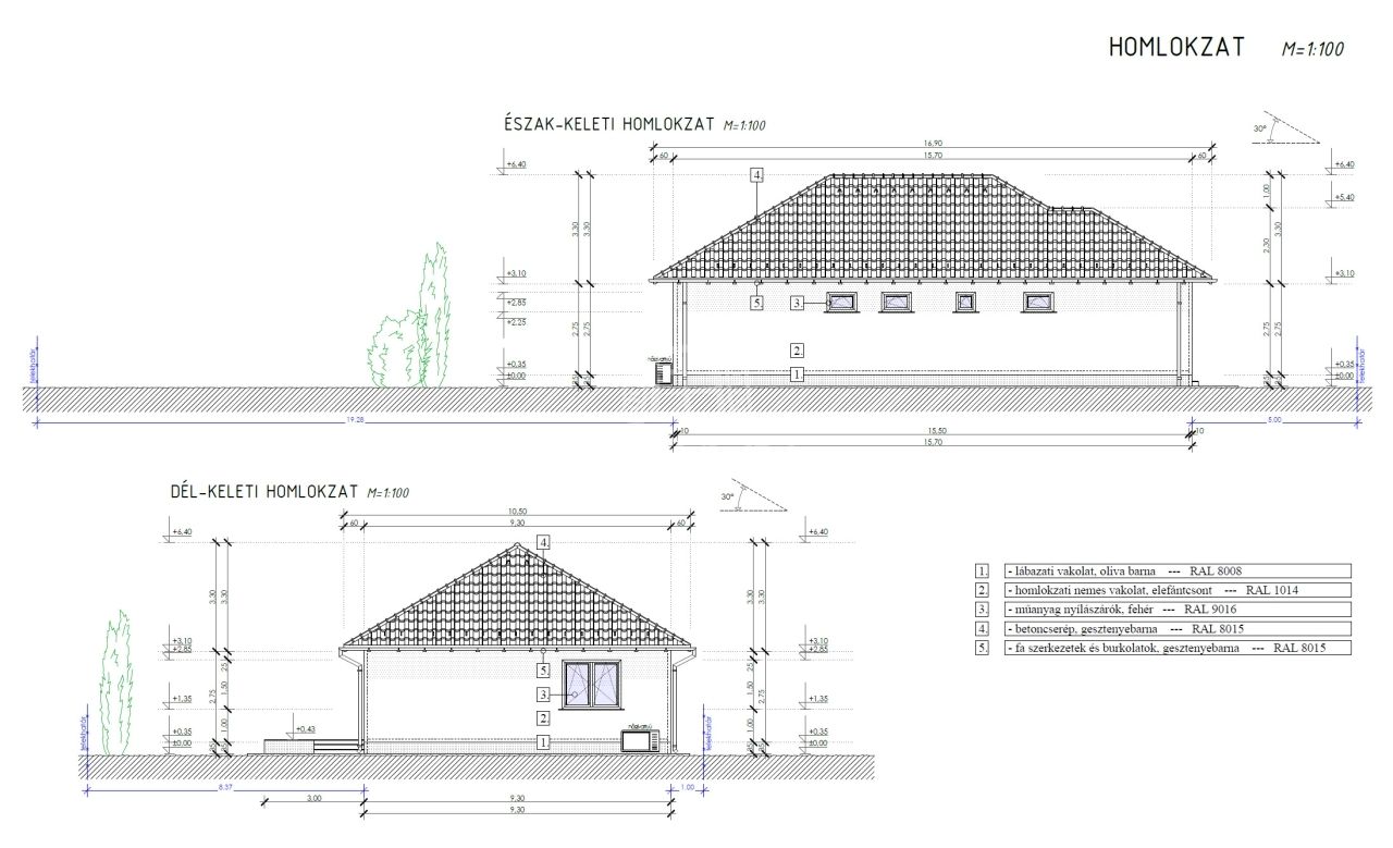 A tető héjazata antracit betoncserép lesz, a homlokzatok 15cm EPS, a padló 10cm Austrotherm AT-N100-as, a vízszintes födém 25cm Ásványgyapot szigeteléssel lesz ellátva.