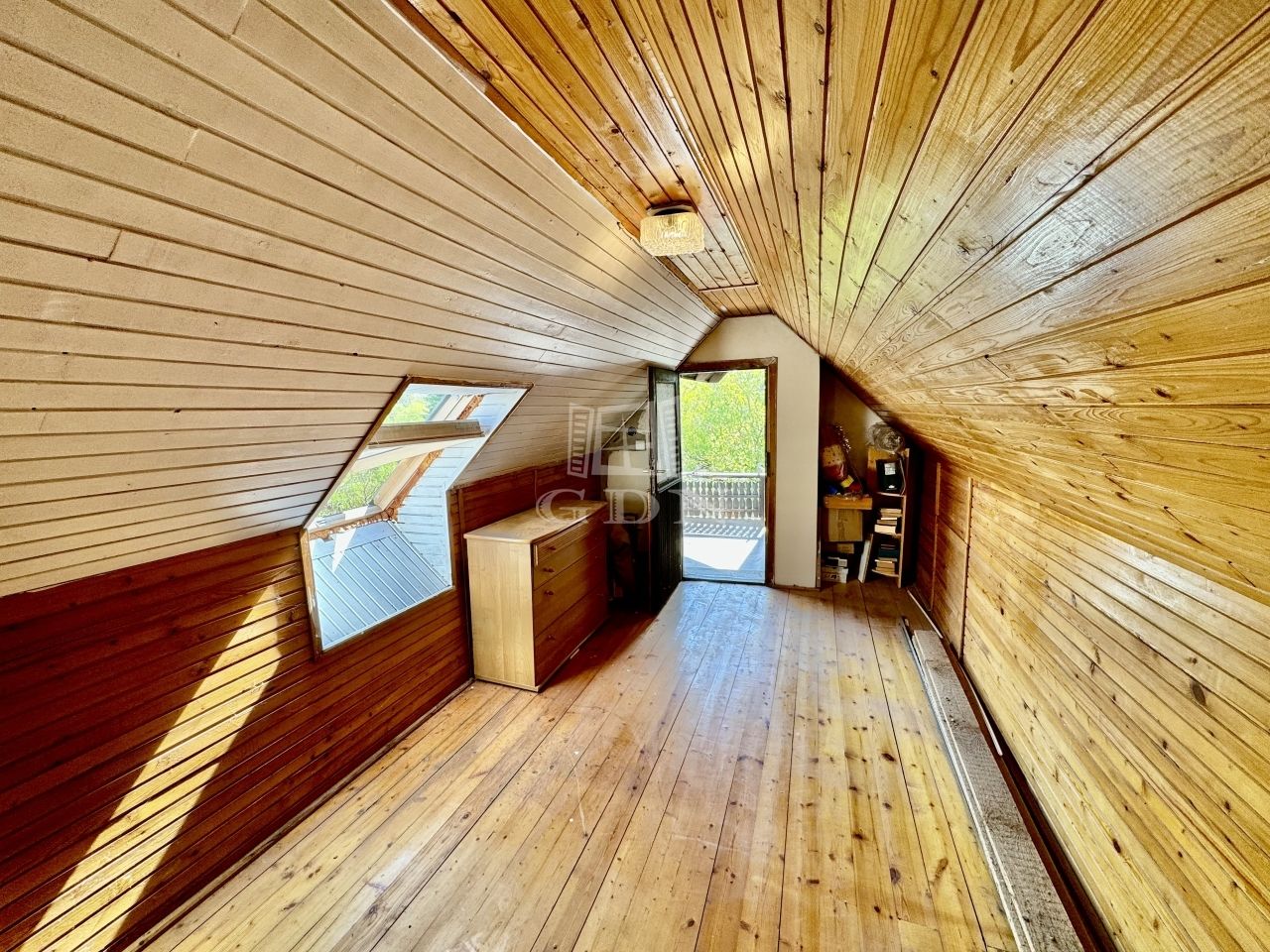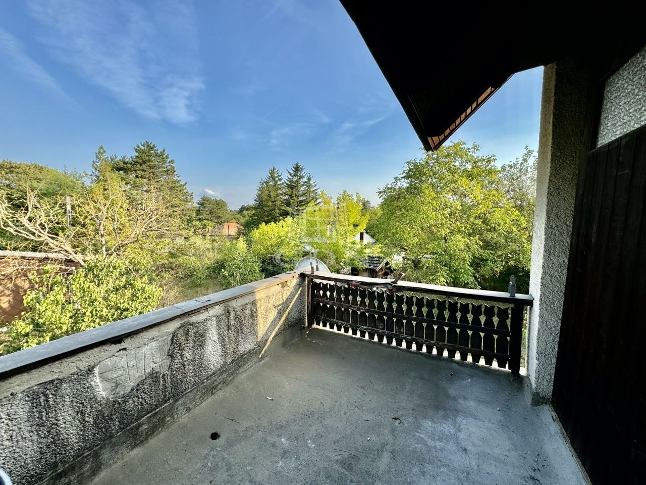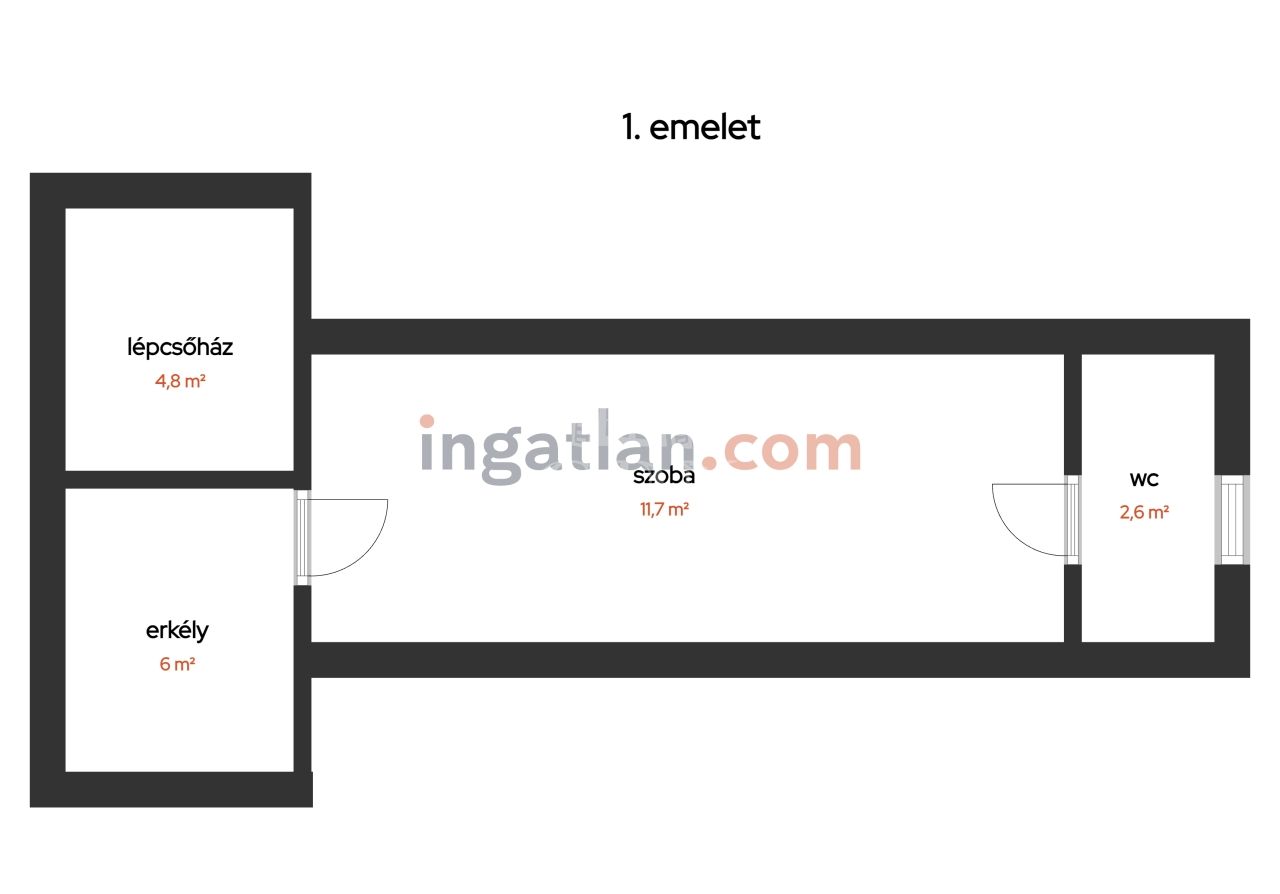 A lépcsőházból a felső szintre érkezve egy 6 m²-es erkélyen találjuk magunkat. A tetőtér 11,5 m²-es szobája erről az erkélyről nyílik. Ehhez az emeleti szobához a szoba végéből nyílóan tartozik egy mellékhelyiség (WC+kézmosó) is.
