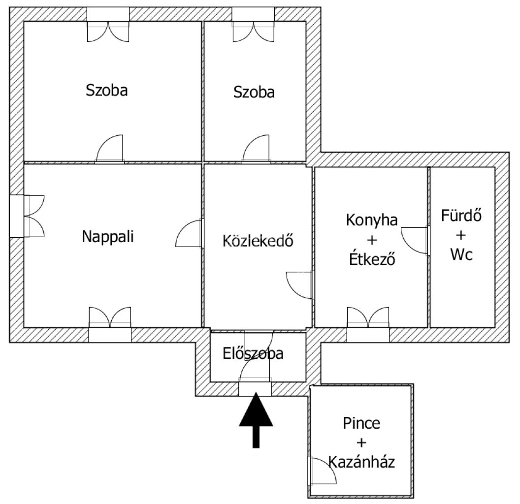Az épület az 1920-as években épült, beton alapra, kalapácsos téglából (45 cm), fa födémmel, kerámiacserép fedéssel. Az ingatlan 1999- ben nagyobb felújításon esett át, azóta a nyílászárók lettek részben kicserélve (műanyag thermo üvegezésel). A házba közművekből egyedül a villany van bevezetve, a víz fúrt kútból szivattyúval jut be az ingatlanba, szennyvíz saját emésztőbe folyik, a fűtés pedig vegyestüzelésű kazánnal megoldott, ami a pincében található.
