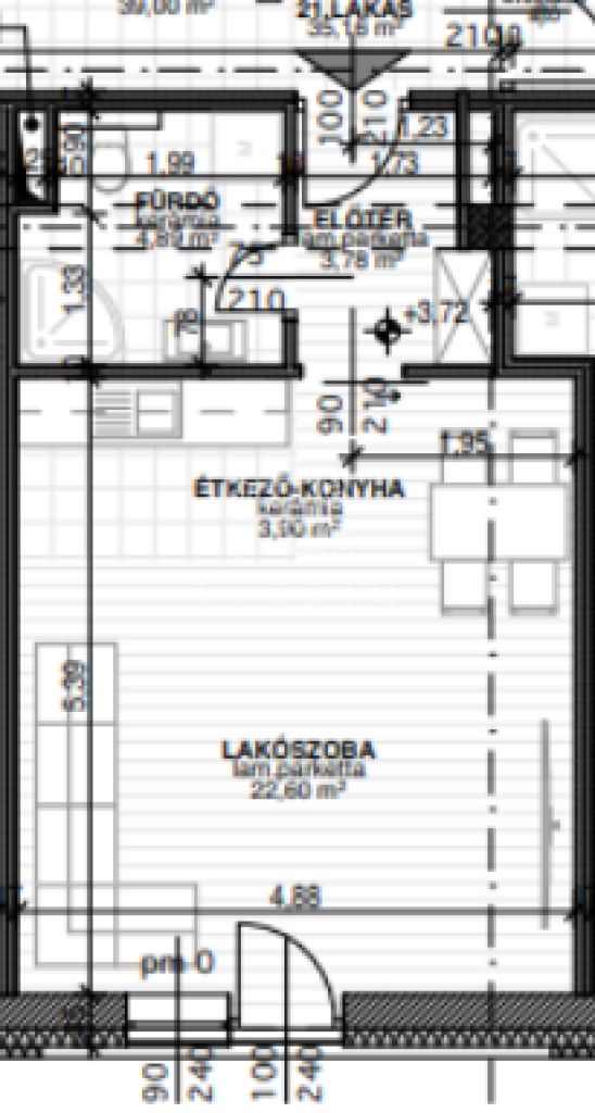 A lakás 36,60 nm, helyiségei:előtér 4,68 nm, fürdőszoba 4,92 nm, étkező/konyha 11,00 nm, nappali/lakószoba 18,10 nm.