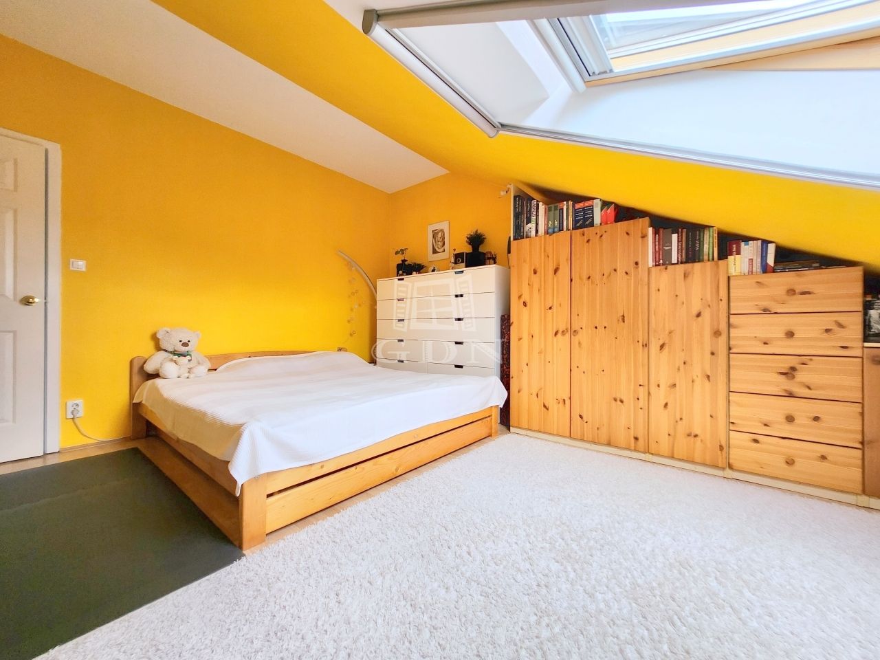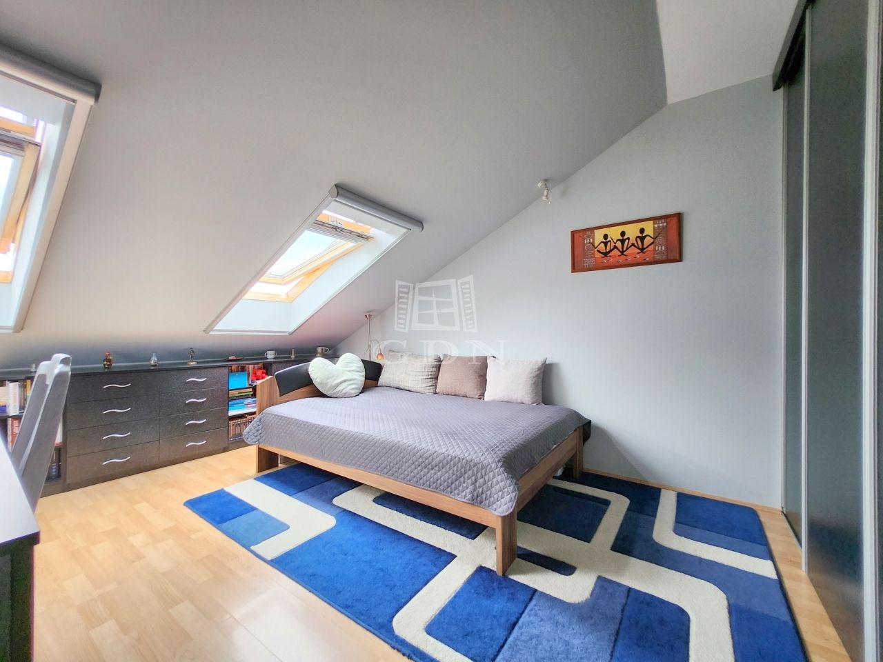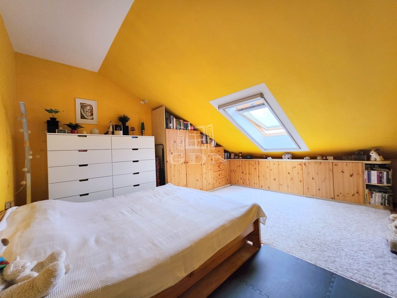 A maximális helykihasználtság érdekében a fürdőszobában, illetve a két hálóban a tetőtéri adottságokat figyelembe véve kifejezetten oda tervezett és gyártott szekrények kaptak helyet.