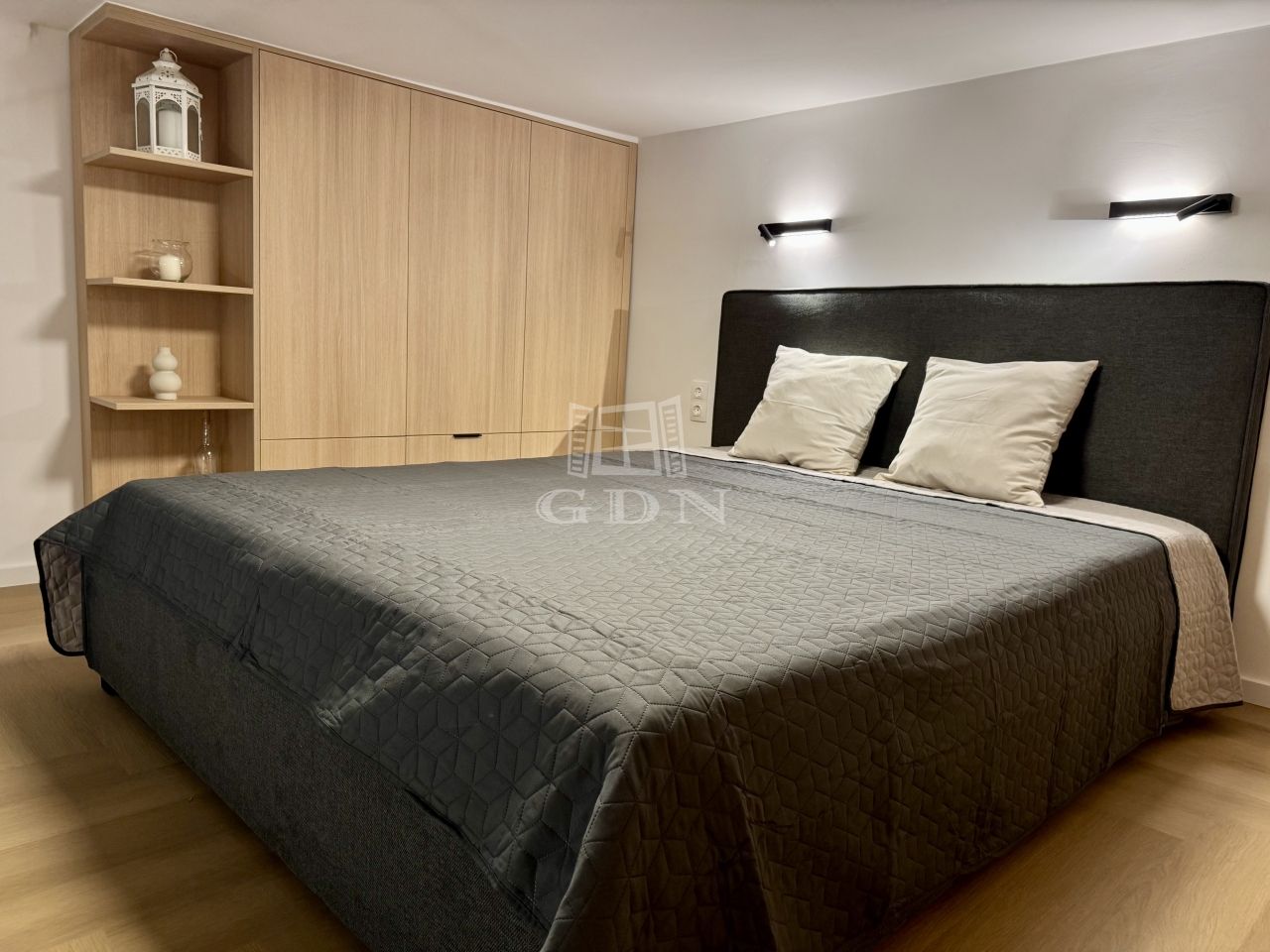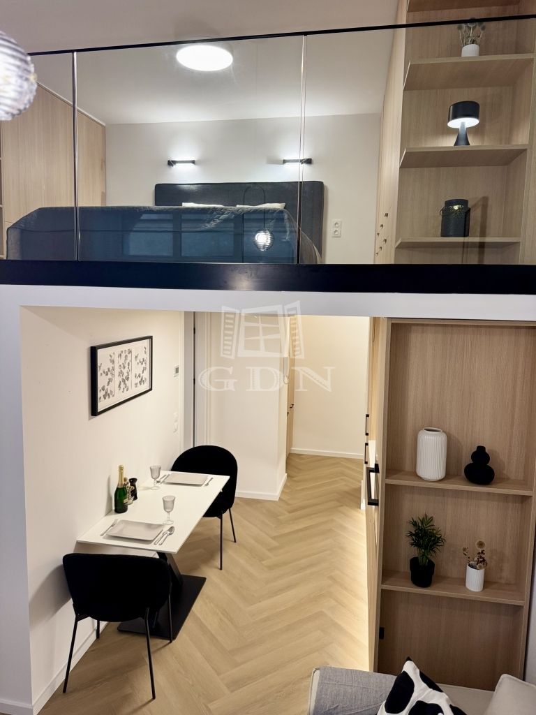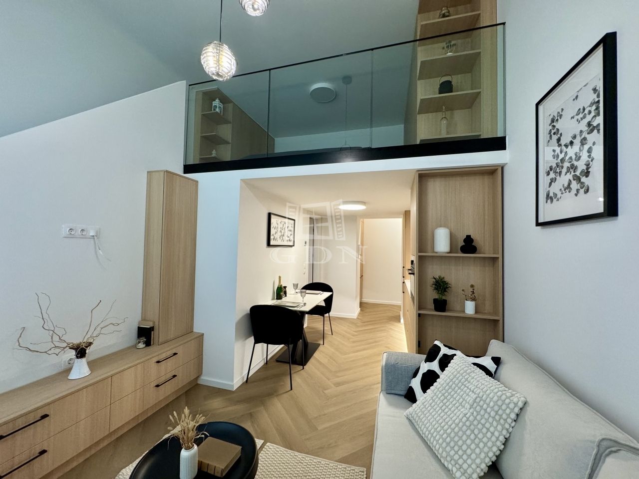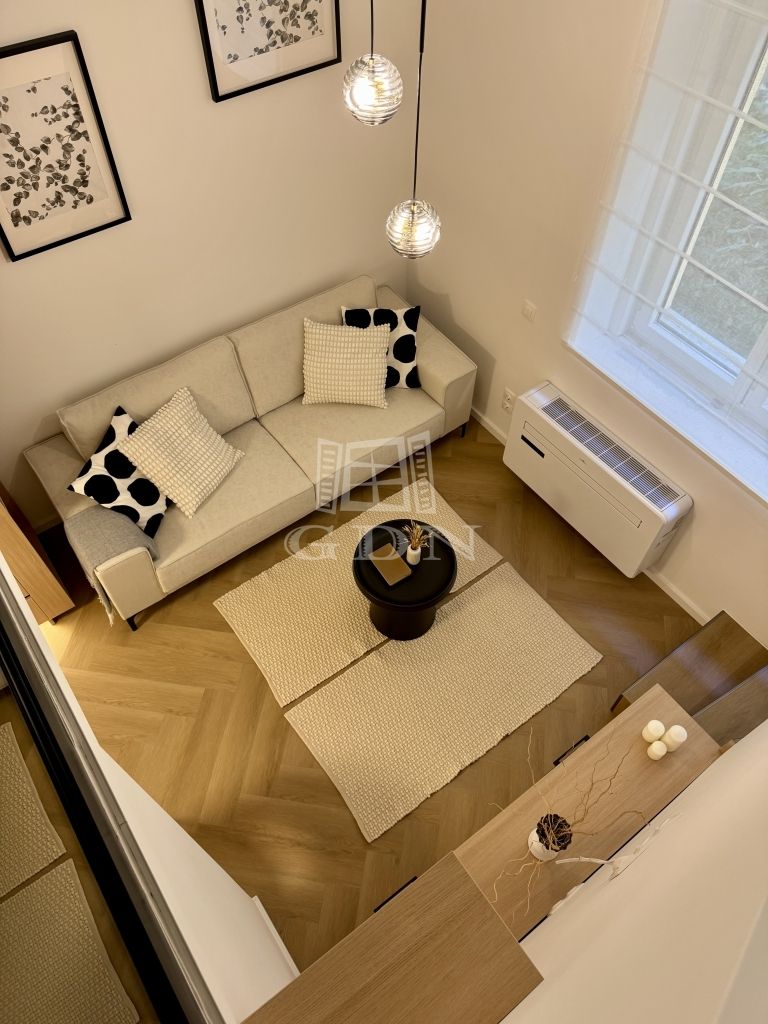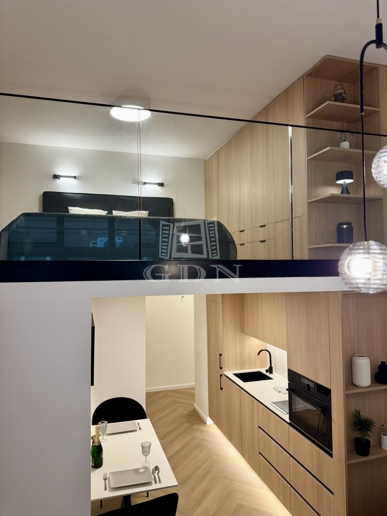A lakás magas belmagassága lehetővé tette egy 11,68 m²-es állógaléria kialakítását, amely hálószobaként és extra tárolóként is funkcionál, így a tér jóval tágasabb és kényelmesebb a megszokottnál.