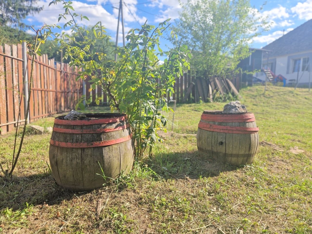 Az 1974 m2 - es, utcafronti kerítéssel ellátott sík területen egy tűzifa tárolására alkalmas "melléképület", valamint egy kerti csap is rendelkezésünkre áll.
