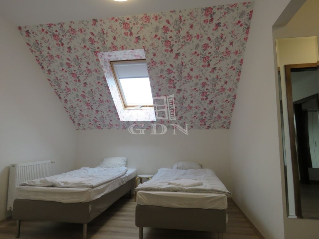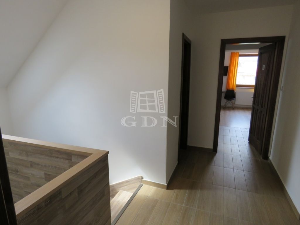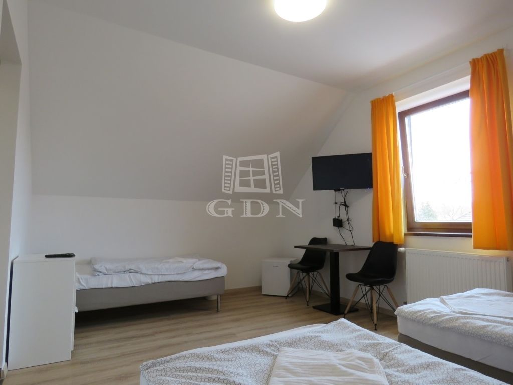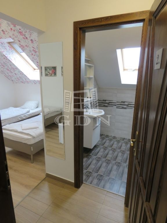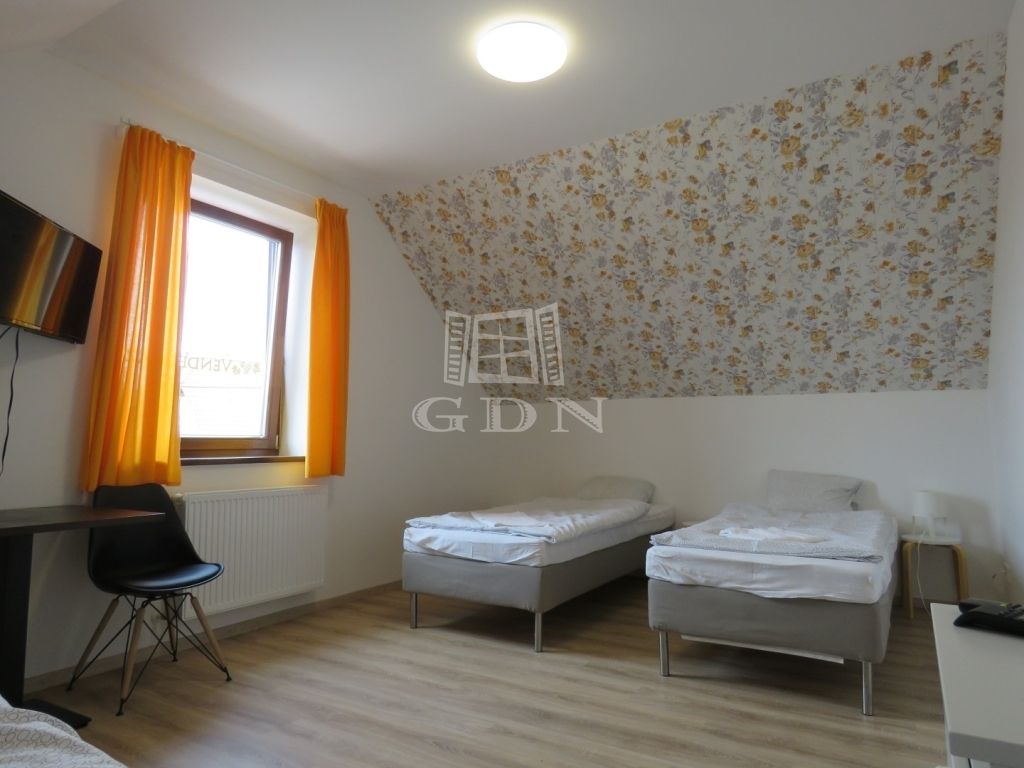 A kétszintes épület emeleten négy (2db 4 ágyas és 2db 3 ágyas), önálló fürdőszobás apartman, illetve egy teakonyha került kialakításra.