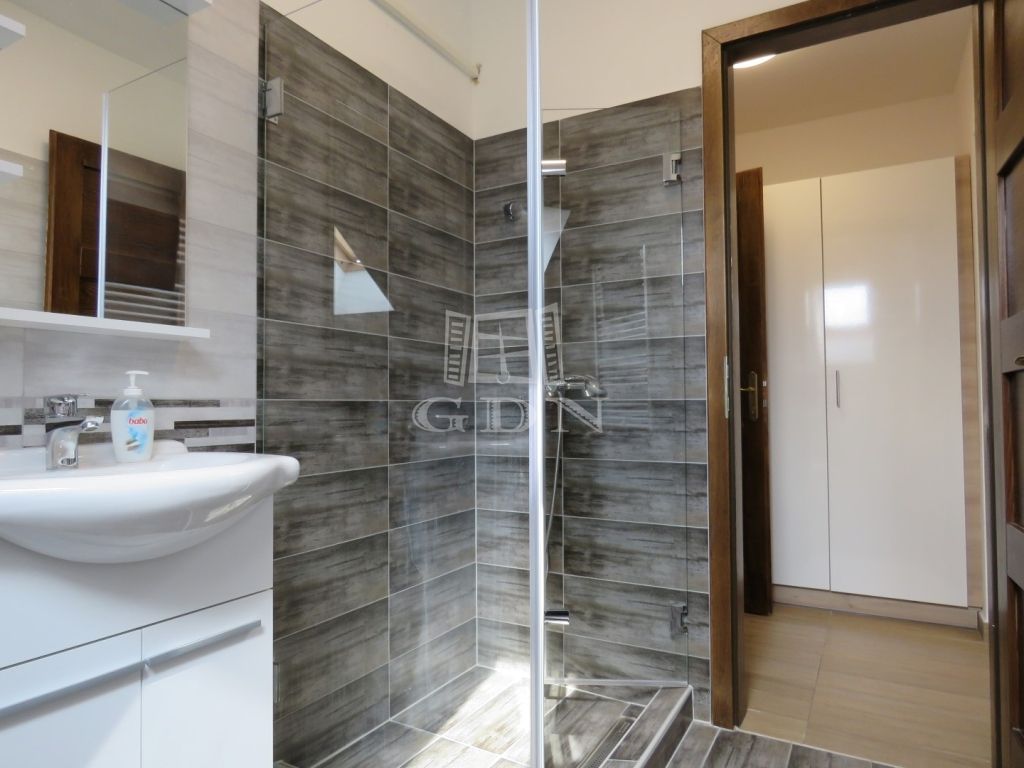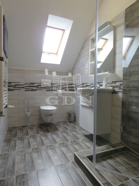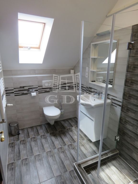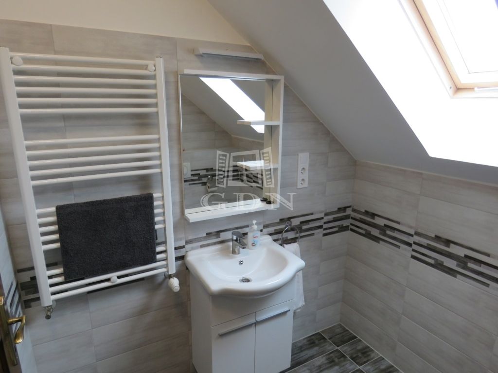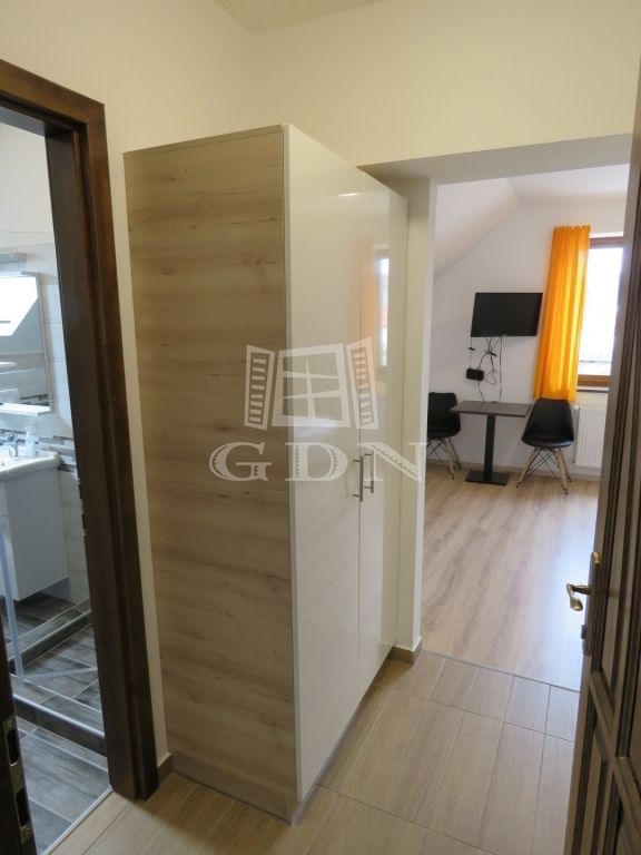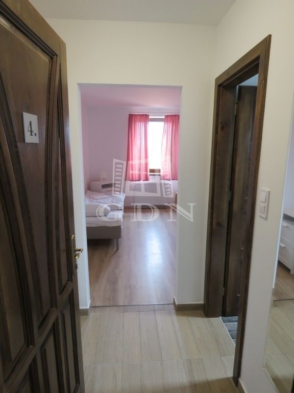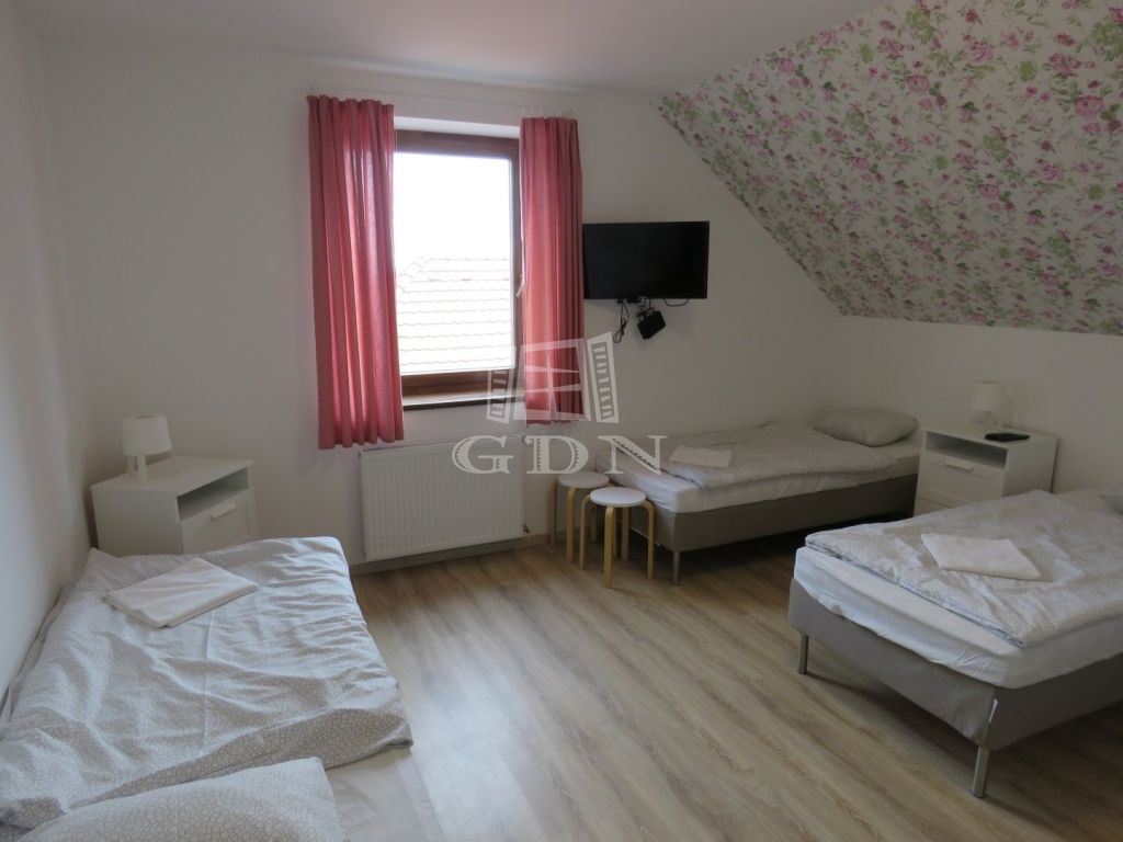 A kétszintes épület emeleten négy (2db 4 ágyas és 2db 3 ágyas), önálló fürdőszobás apartman, illetve egy teakonyha került kialakításra.