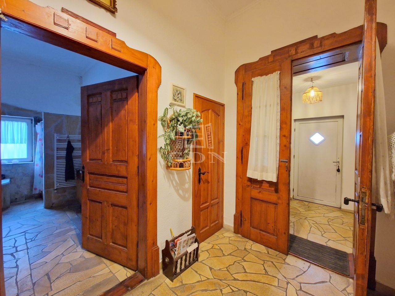 Az otthon helyet ad egy előtérnek, egy közlekedőnek, egy konyha-étkező együttesnek, az onnan nyíló spejznek, a mosókonyhaként használt pince lejárónak, galériás nappalinak, 2 hálónak, egy zuhanyzóval, sarokkáddal és toalettel felszerelt fürdőnek, valamint plusz egy külön helyiségben található toalettnek.