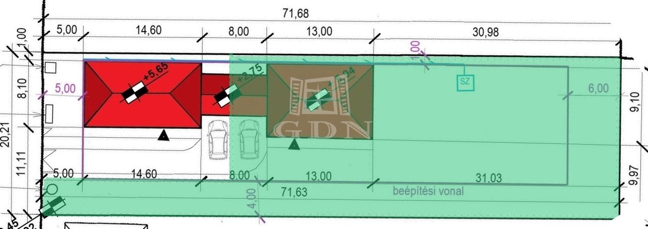 Az ingatlanok csak a fedett kocsibeállókkal érintkeznek.