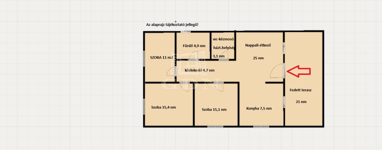 Ezenkívül egy félfallal elválasztott 7,4 nm-es konyha, 3 szoba