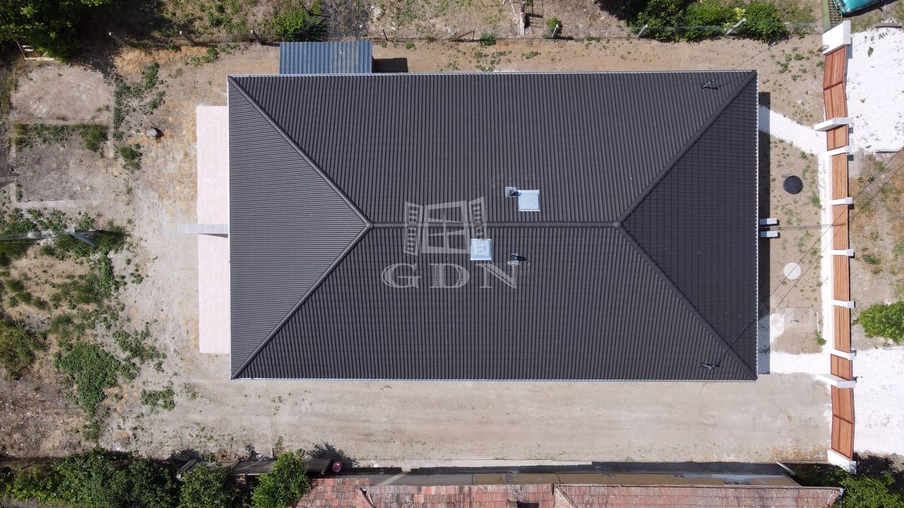 A tető antracitszürke cserép fedést kap, rendszertartozék kiegészítőkkel. (szellőzők, hófogók), (pl.: CREATON BALANCE) A tetőlécezés alá hálóerősített vízzáró, páraáteresztő alátétfólia kerül (pl.: Masterplast Mastermax 3 Classic) Az alátétfólia csatlakozásait és az áthatásokat (pl: CREATON SKL speciális ragasztóval) vízálló-és szélálló módon kell készíteni!