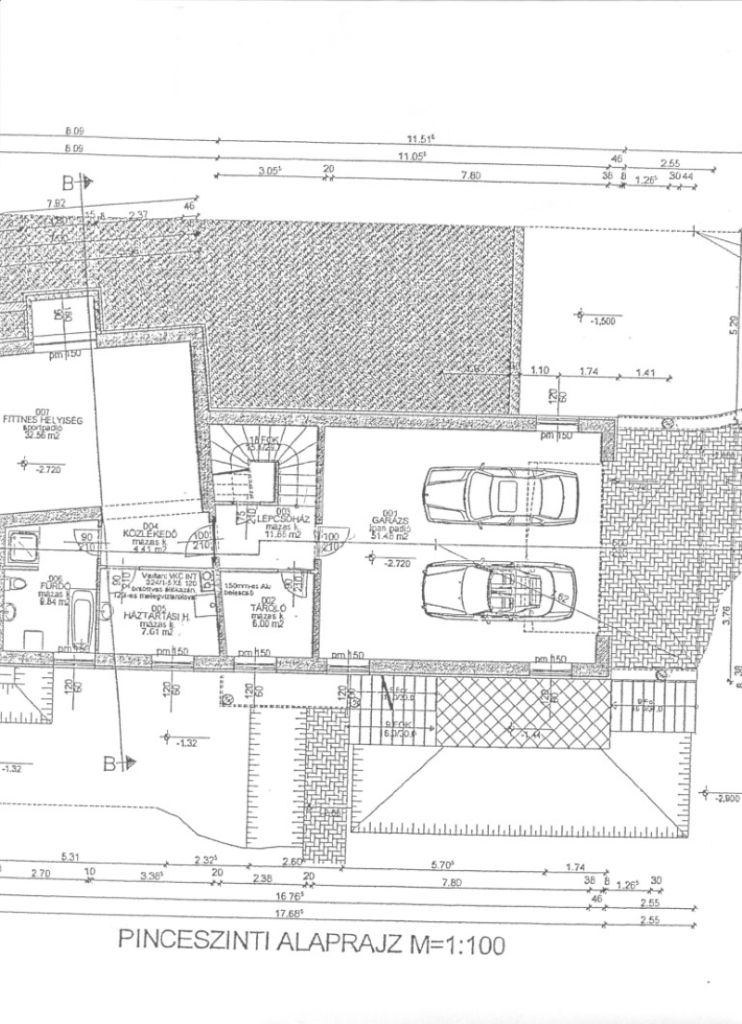 A pinceszinten kétállásos, elektromos kapuval ellátott garázs, gardrób helyiség, kazánház, mosókonyha zuhanyzós fürdővel, valamint egy tágas fitneszterem került kialakításra.
