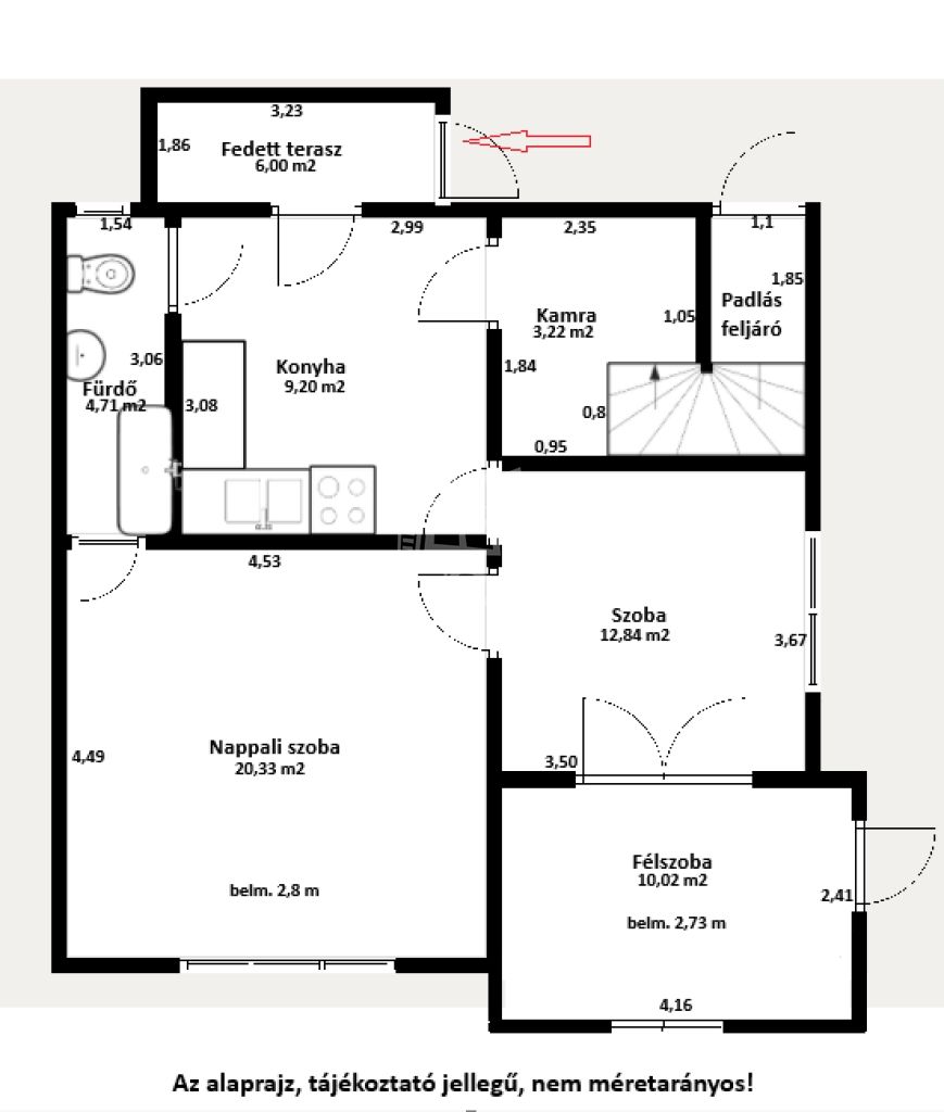 A bruttó méretbe a fedett terasz 50 %-a és a külső padlásfeljáró is benne van.