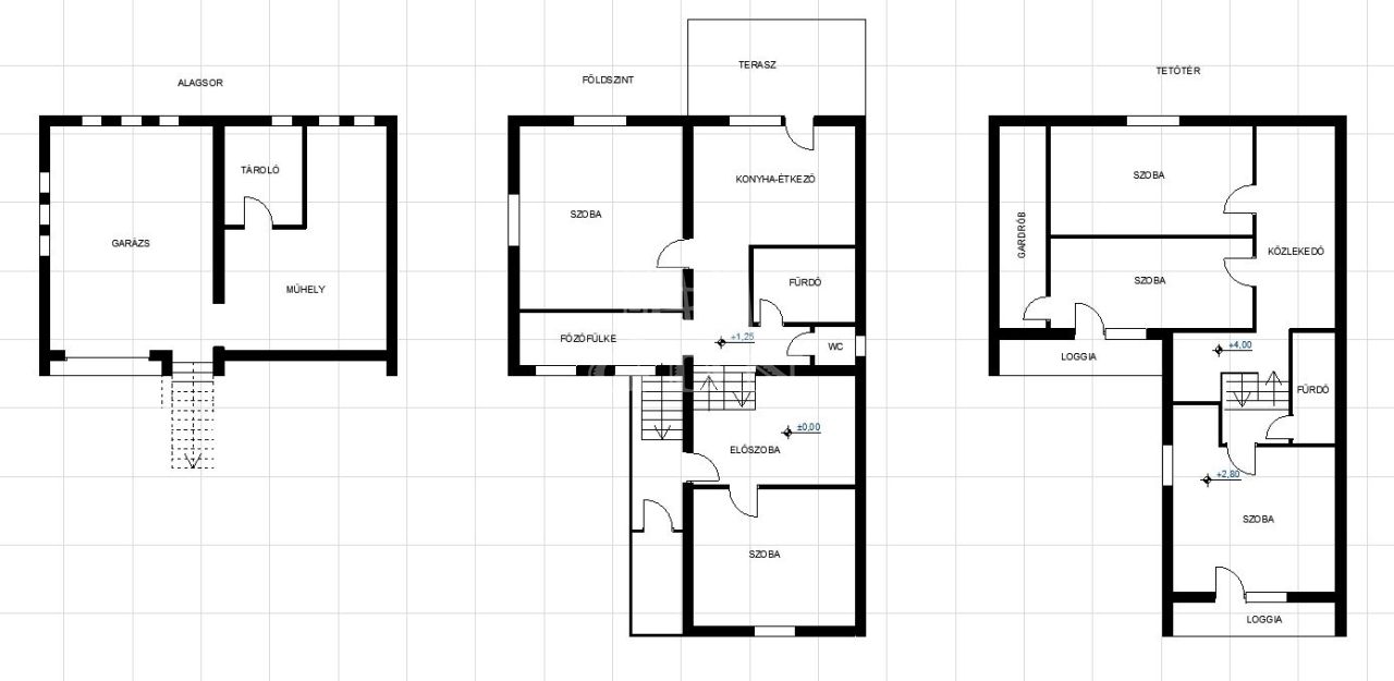 - Az alsó szinten üvegbejáratú teraszról a garázsba és az alsószint előszobájába lépünk. Innen nyílik egy nagyobb méretű szoba, valamint a lépcsőfeljáró. A lépcsőfeljárón keresztül jutunk el a következő szint főzőfülkéjéhez, amely akár szoba kialakítására is alkalmas lehet, még egy nagyobb szobát találunk itt, a konyhát, a fürdőszobát, WC-t, valamint a kertkapcsolatos teraszt.