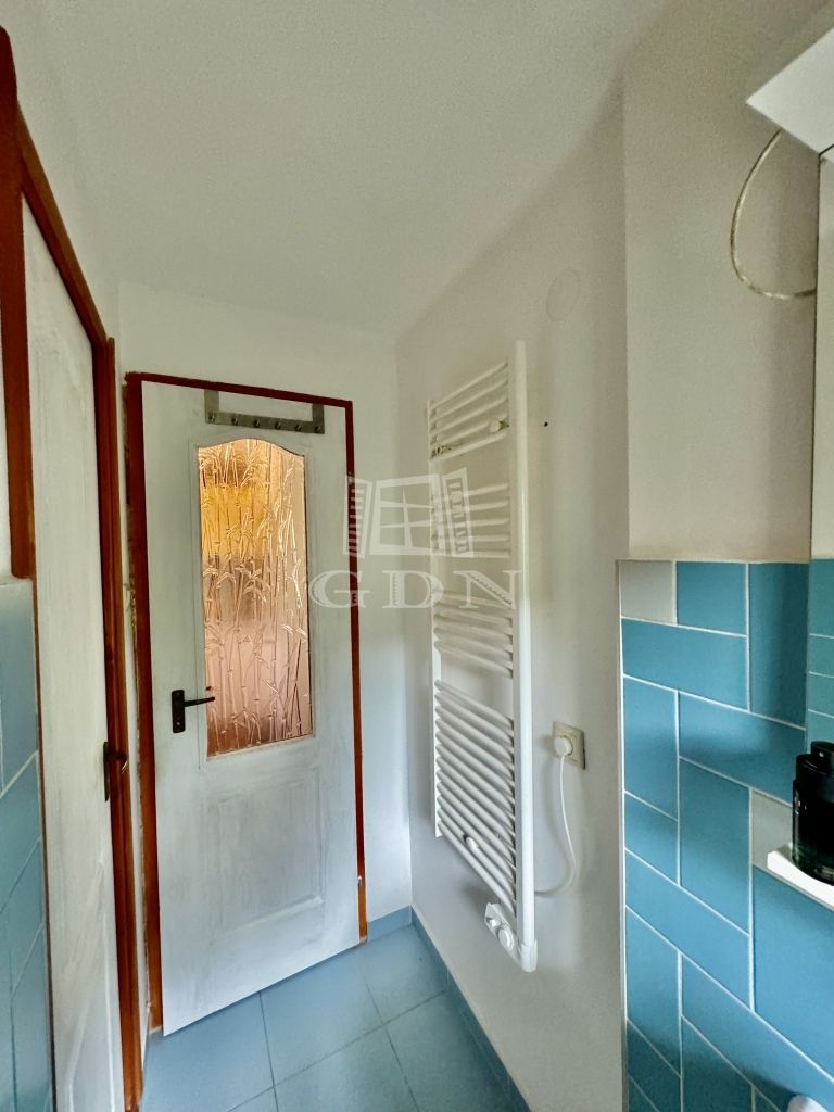 2,7 m²-es zuhanyzós fürdőszoba, aminek komfortjáról egy elektromos törülközőszárítós radiátor gondoskodik.
