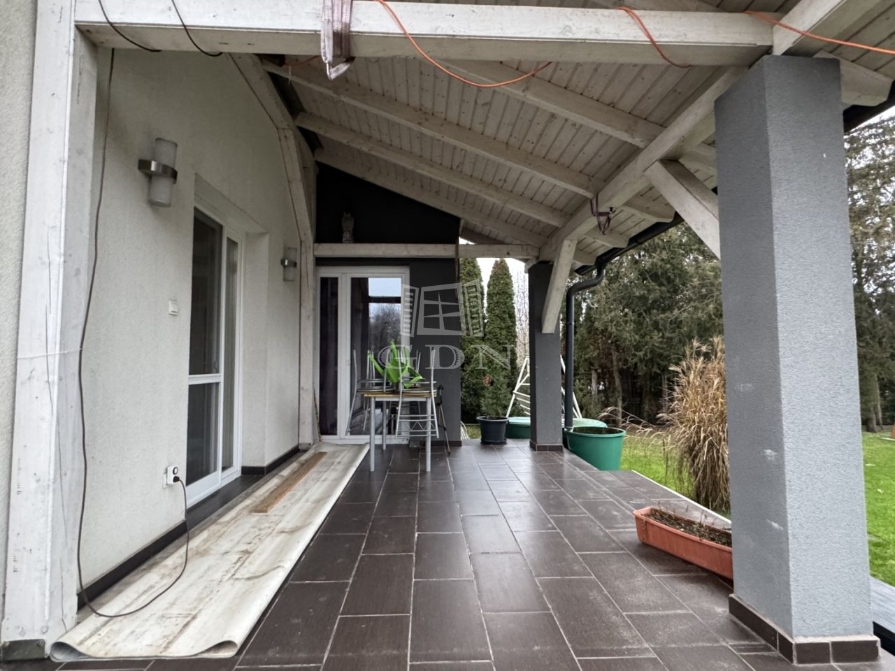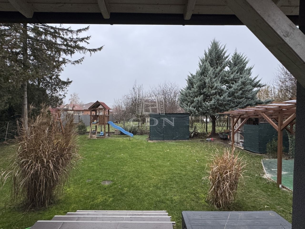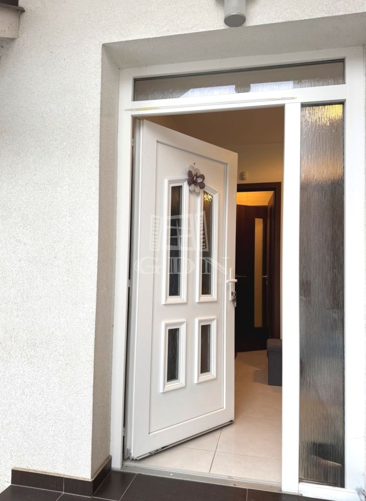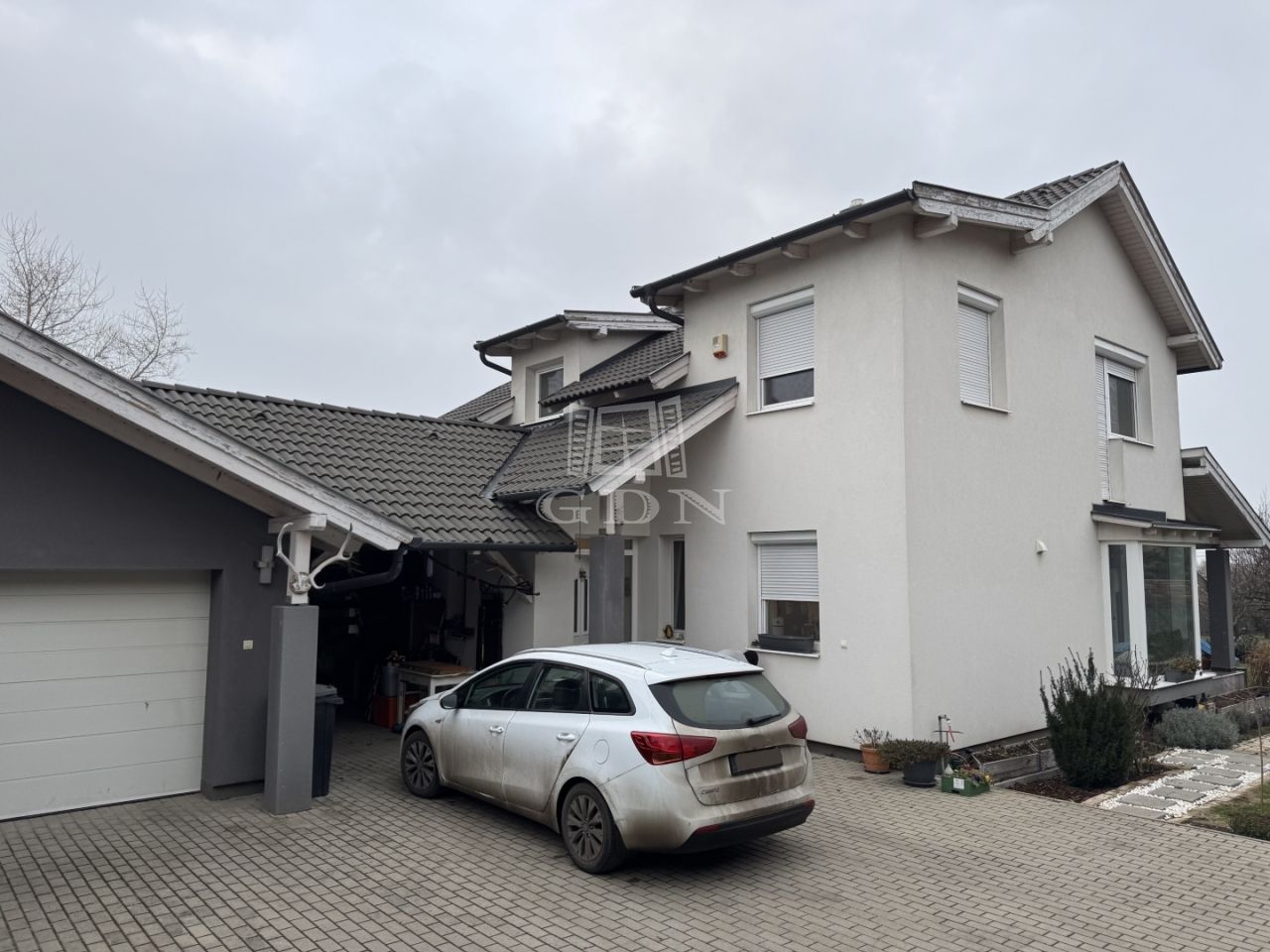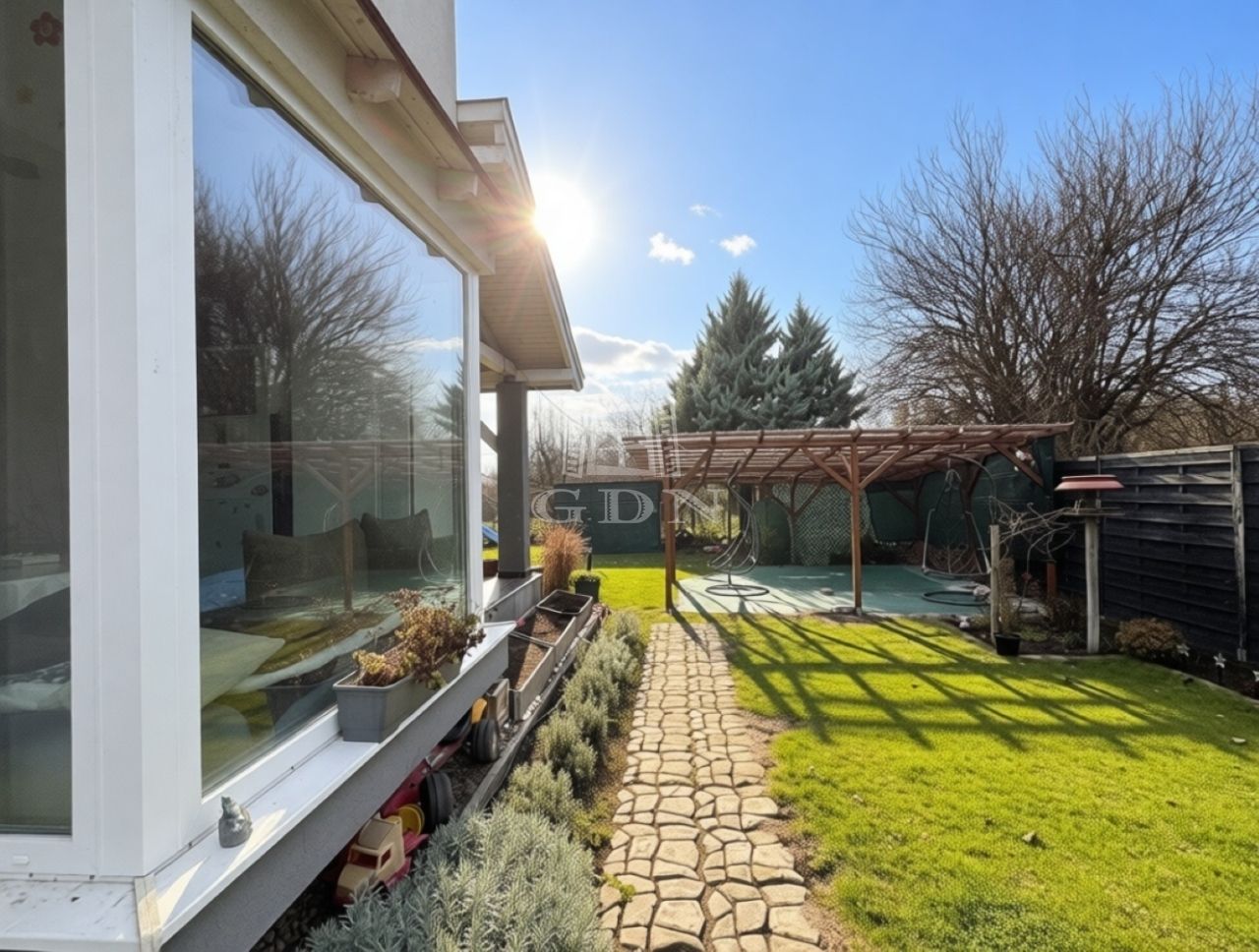 A telek 584m2, egy része térkövezett, hátsó része füvesített. A házhoz kapcsolódik egy fedett beálló és egy garázs is.