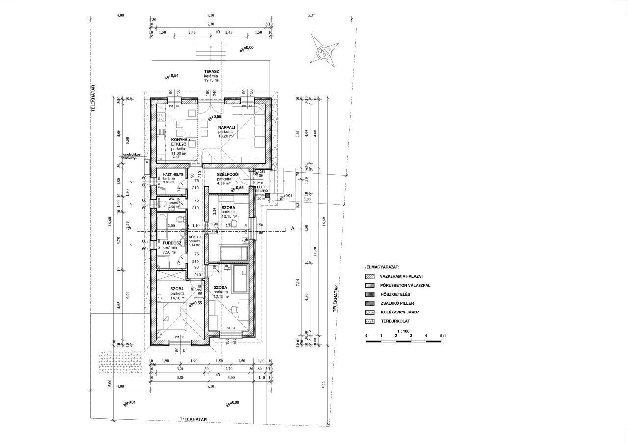 A tartószerkezeti falak Porotherm P30N+F téglából, betonkoszorúval, fa födémes tetőszerkezettel készülnek. A lábazat 10 cm polisztirol lépésálló, a homlokzatok 10cm-es Austrotherm Grafitos, a vízszintes födém 25 cm ásványgyapot szigeteléssel lesz ellátva.