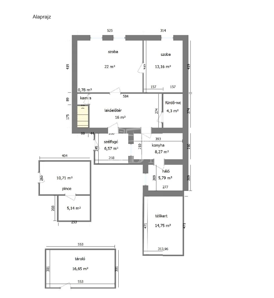 A ház: kb 76 m2 hasznos alapterületű, kialakításra került egy tágas előtér, konyha ,étkező, 2,5 szoba, 1 fürdő, wc, kamra, garázs és tárolók-ólak.