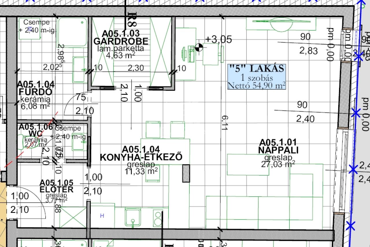 A05 lakás: 54,9 m2|konyha + étkező - nappali, hálószoba, előtér, gardrób, fürdő, wc,