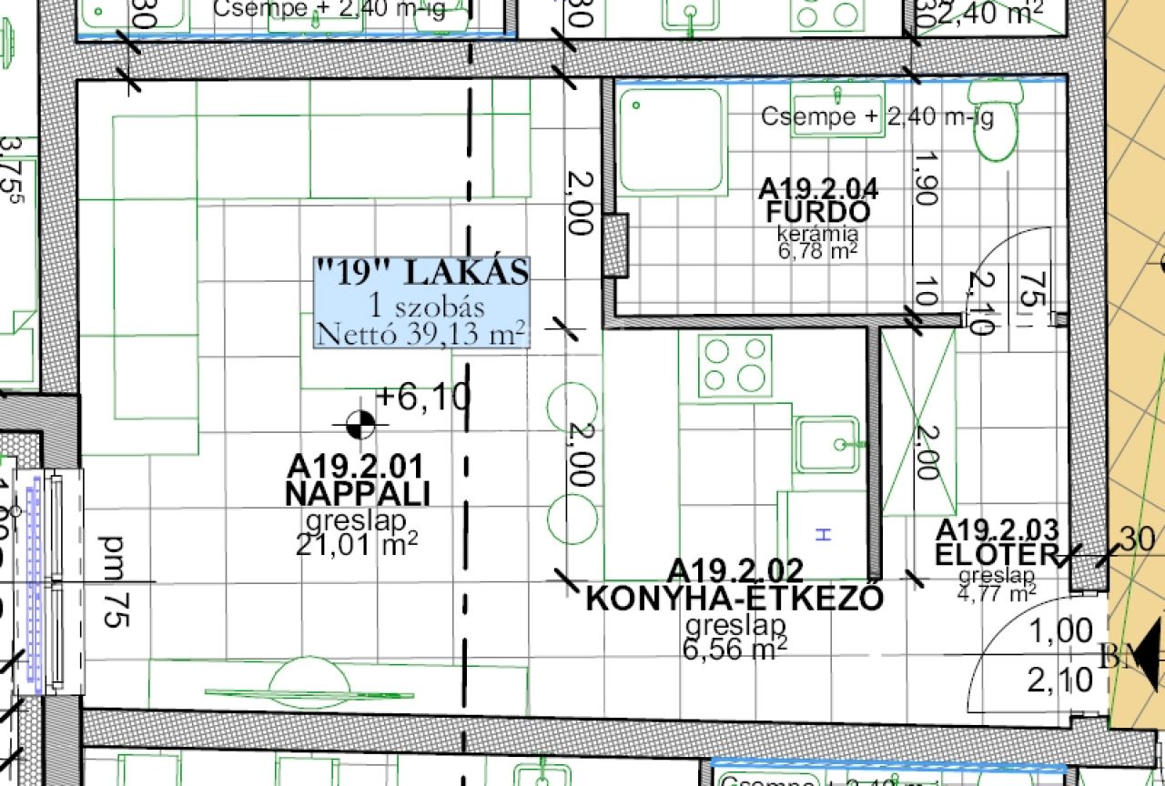 Elrendezés: konyha + étkező – nappali, előtér, fürdő/wc egyben