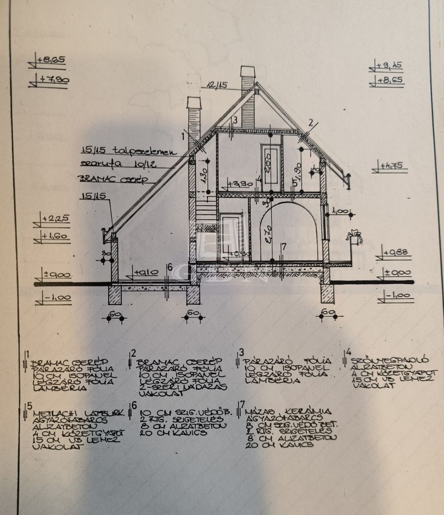 A ház 1987-ben beton sávalapra épült 30-as téglából, a tető héjalása Bramac betoncserép. A tető fújható kőzetgyapot szigetelést kapott,