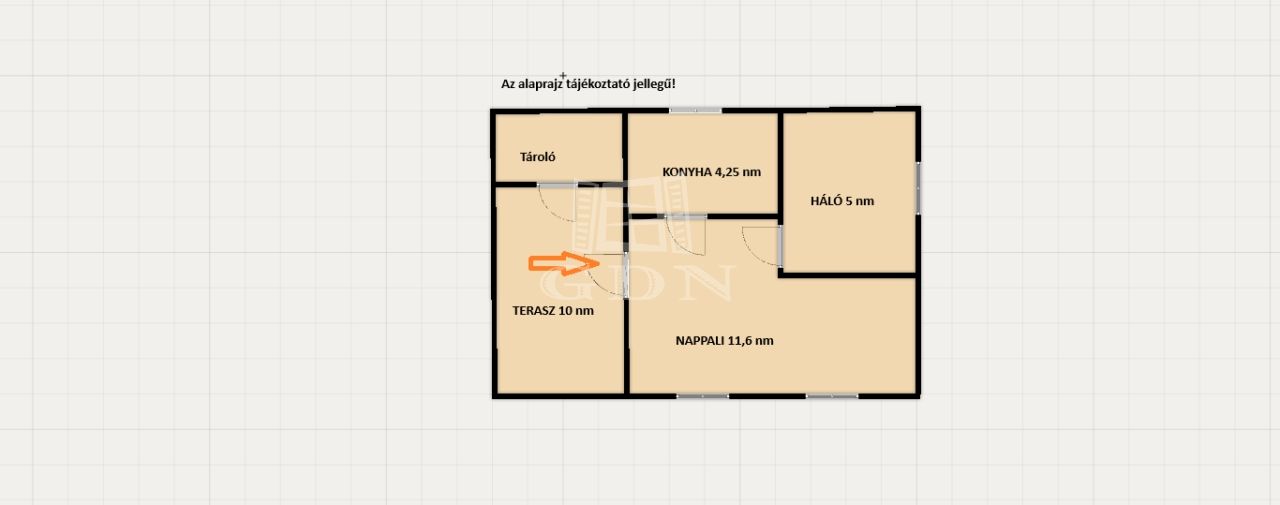 11,6 nm-es nappali, 5 nm-es háló, 4,25 nm-es konyha, 10 nm-es terasz, és 1,2 nm-es külső tároló kapott helyet. Mögötte szaletli, előtte fedett autóbeálló található.