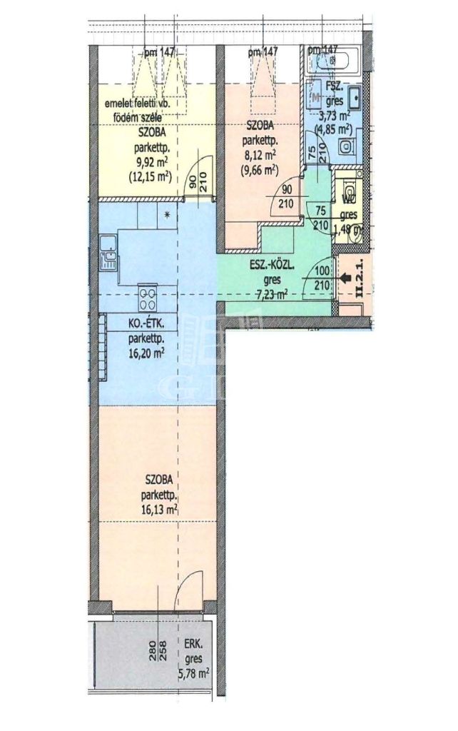 nappali-étkező-konyha 32,33m2, előszoba 7,23m3, szoba 12,15m2, szoba 8,12m2, fürdőszoba 3,73m2, toalett 1,48m2, erkély 5,78m2;