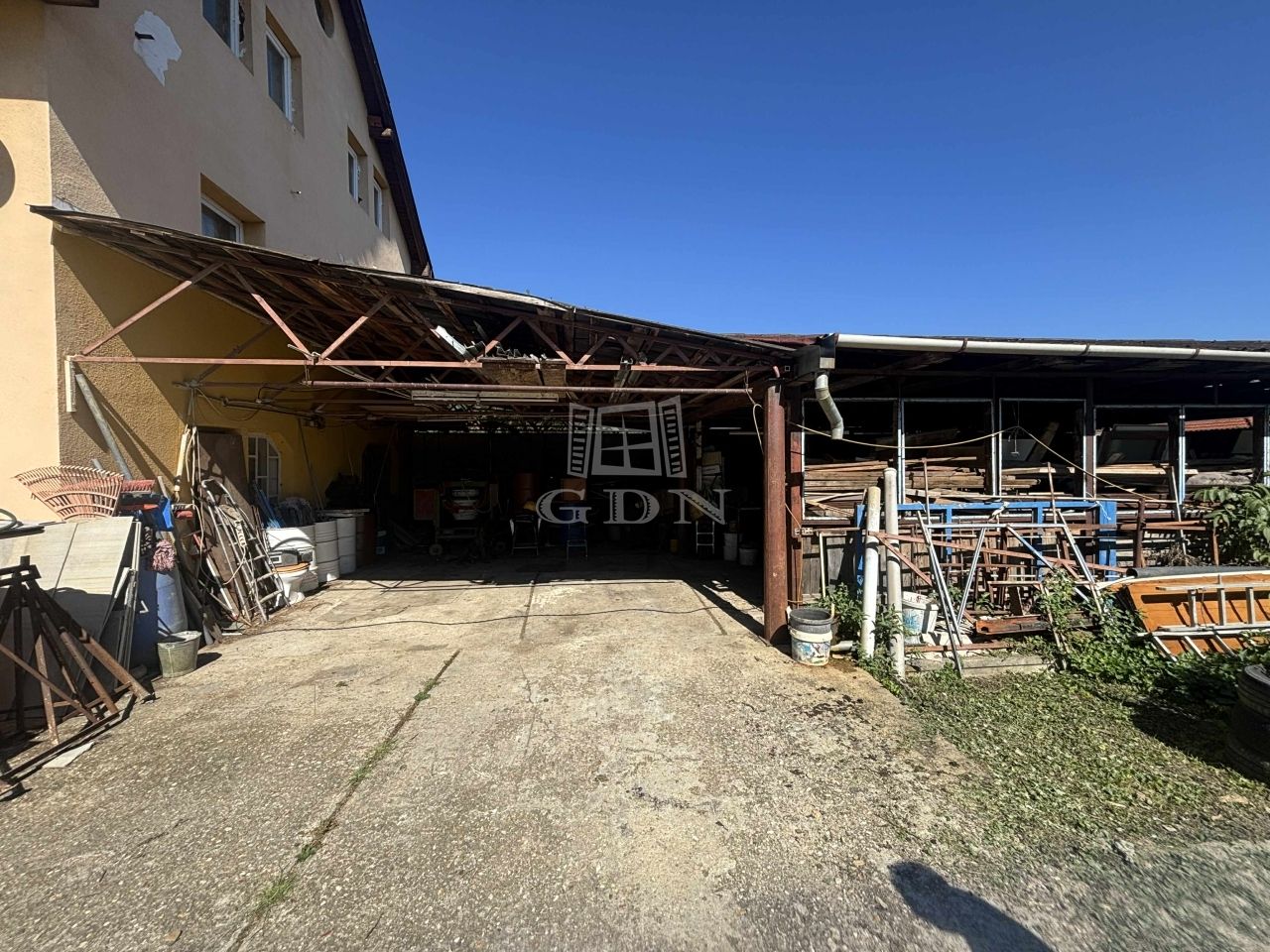 • Felépítmény: 80 m²-es szerkezetkész melléképület (csarnokváz), amely raktárnak vagy műhelynek befejezhető.