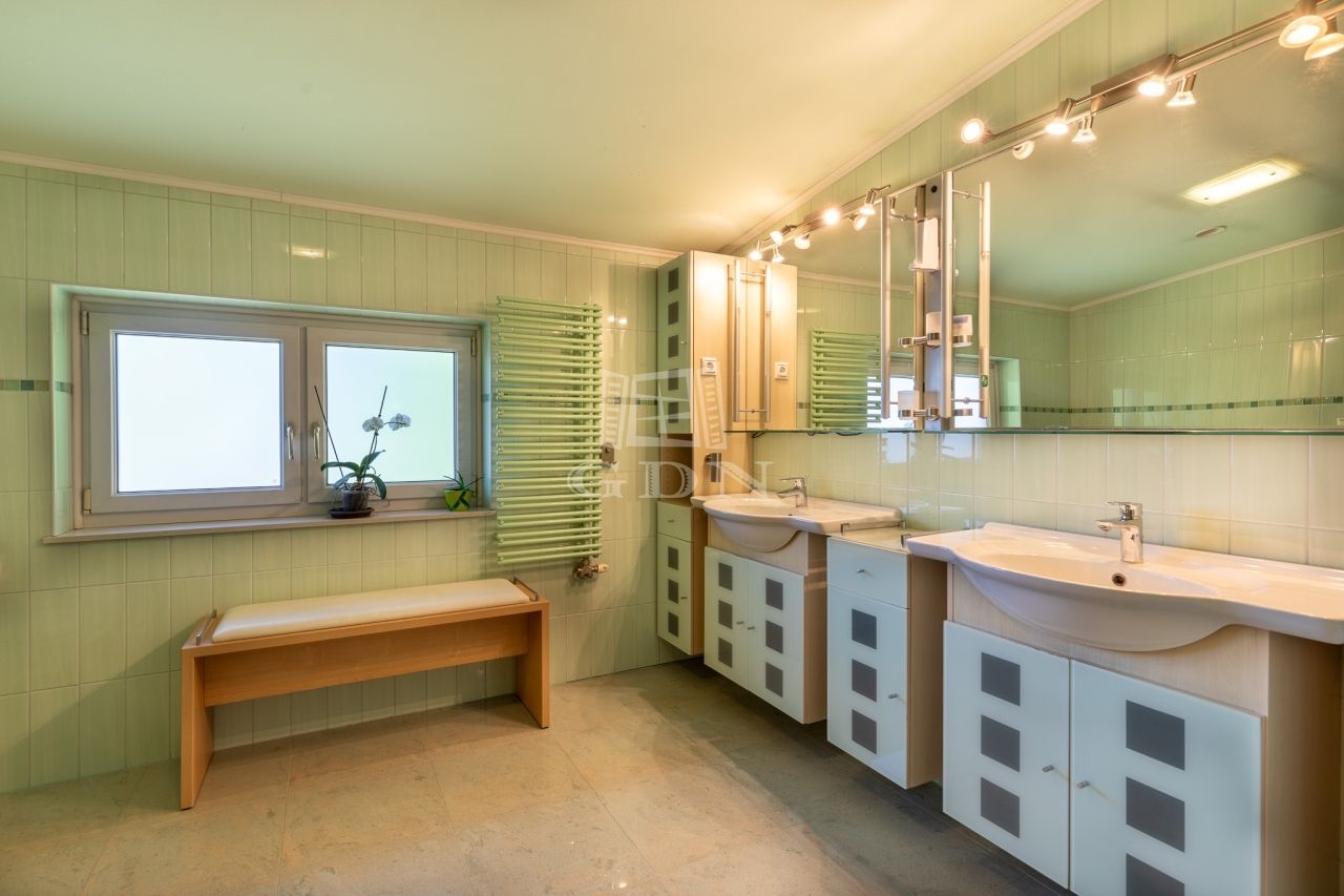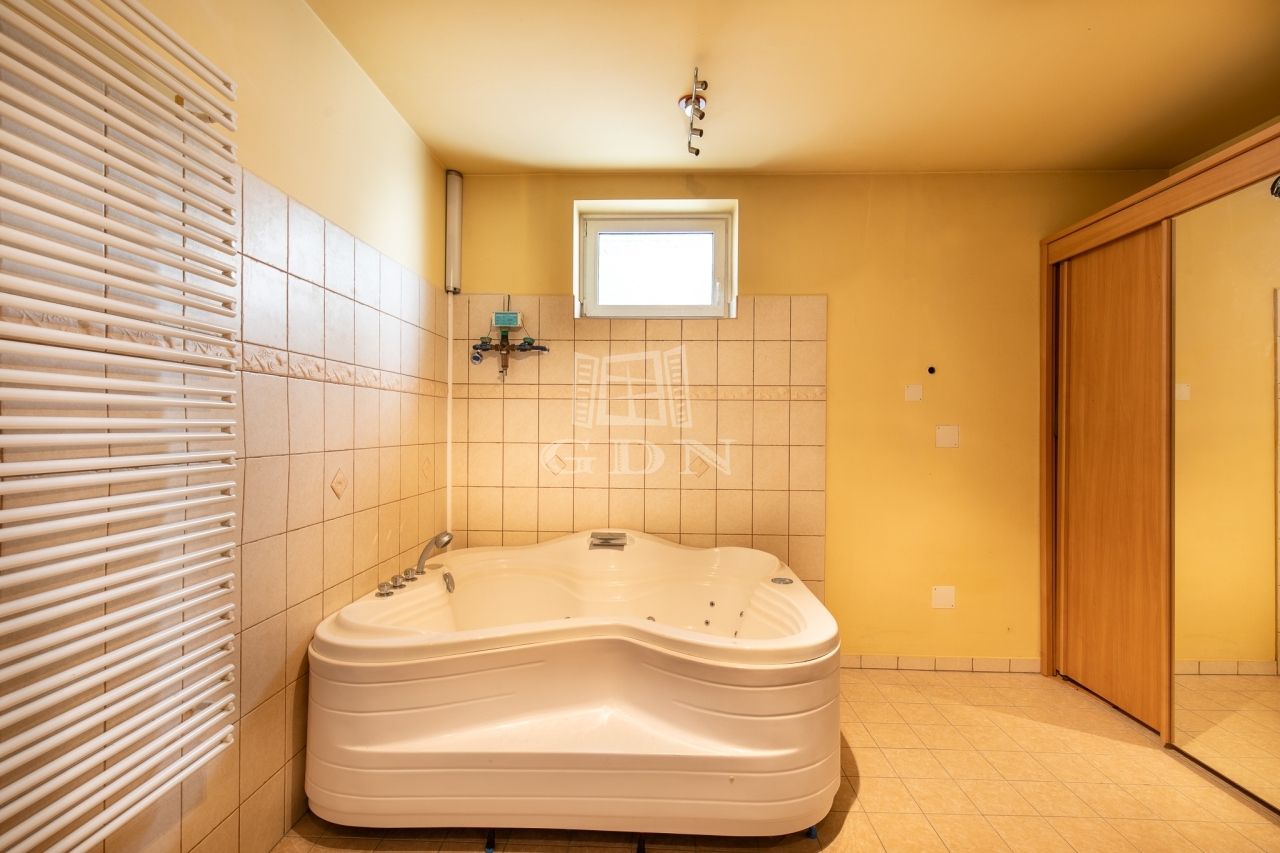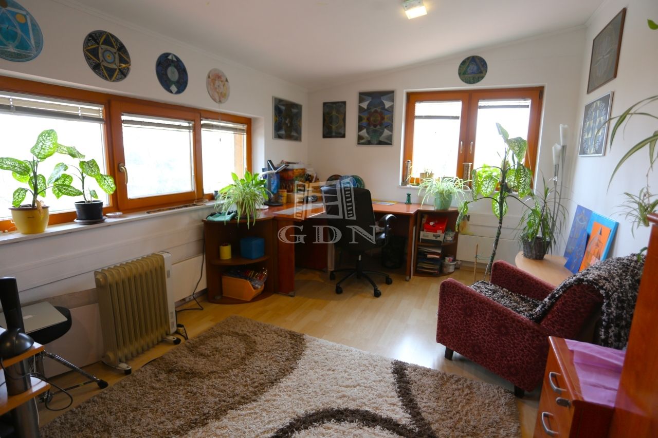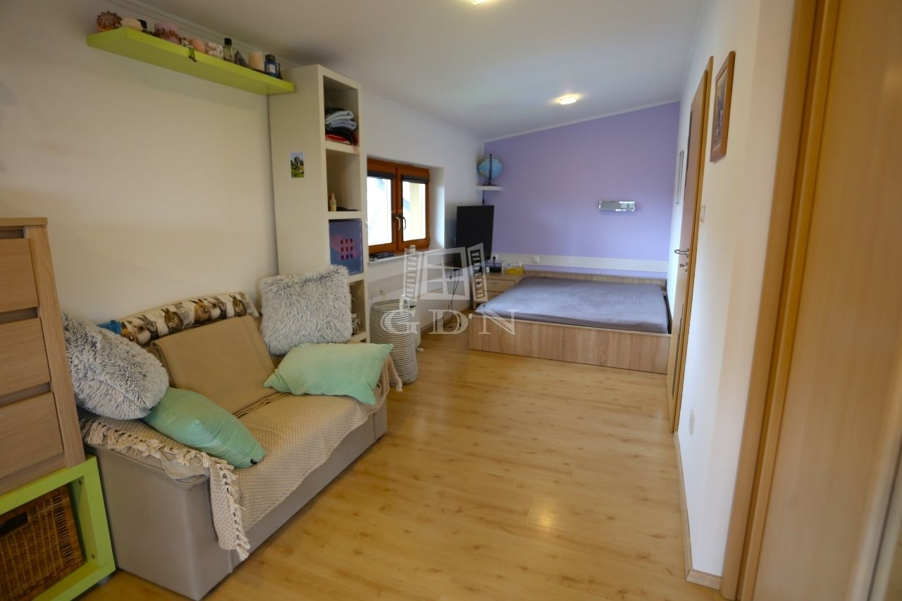 az emeleten négy világos hálószoba kapott helyet, valamint egy zuhanyzós fürdőszoba és egy különálló vizes helyiség is szolgálja a kényelmet. Ugyanitt található a garázs felett kialakított, 60 m²-es beépítésre előkészített tetőtér, amely akár egy külön bejáratú lakássá is átalakítható – ideális többgenerációs együttéléshez vagy irodai funkcióra.