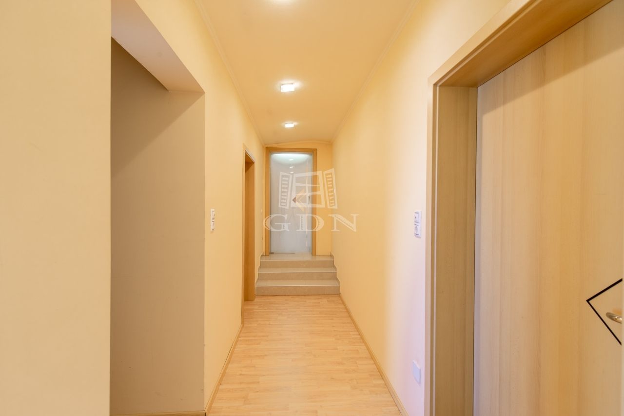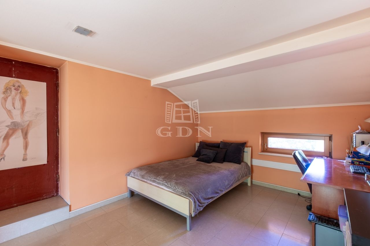 az emeleten négy világos hálószoba kapott helyet, valamint egy zuhanyzós fürdőszoba és egy különálló vizes helyiség is szolgálja a kényelmet. Ugyanitt található a garázs felett kialakított, 60 m²-es beépítésre előkészített tetőtér, amely akár egy külön bejáratú lakássá is átalakítható – ideális többgenerációs együttéléshez vagy irodai funkcióra.