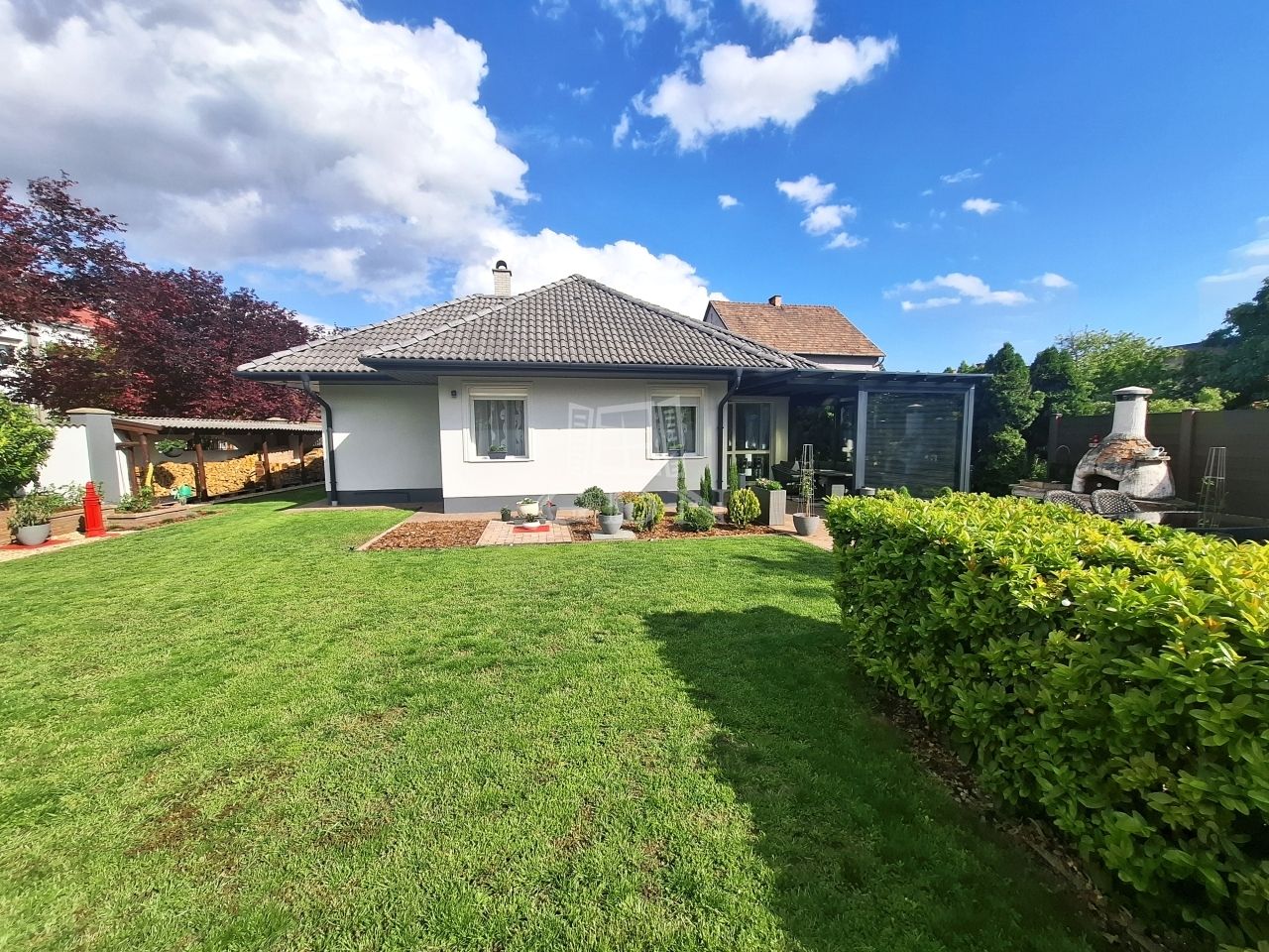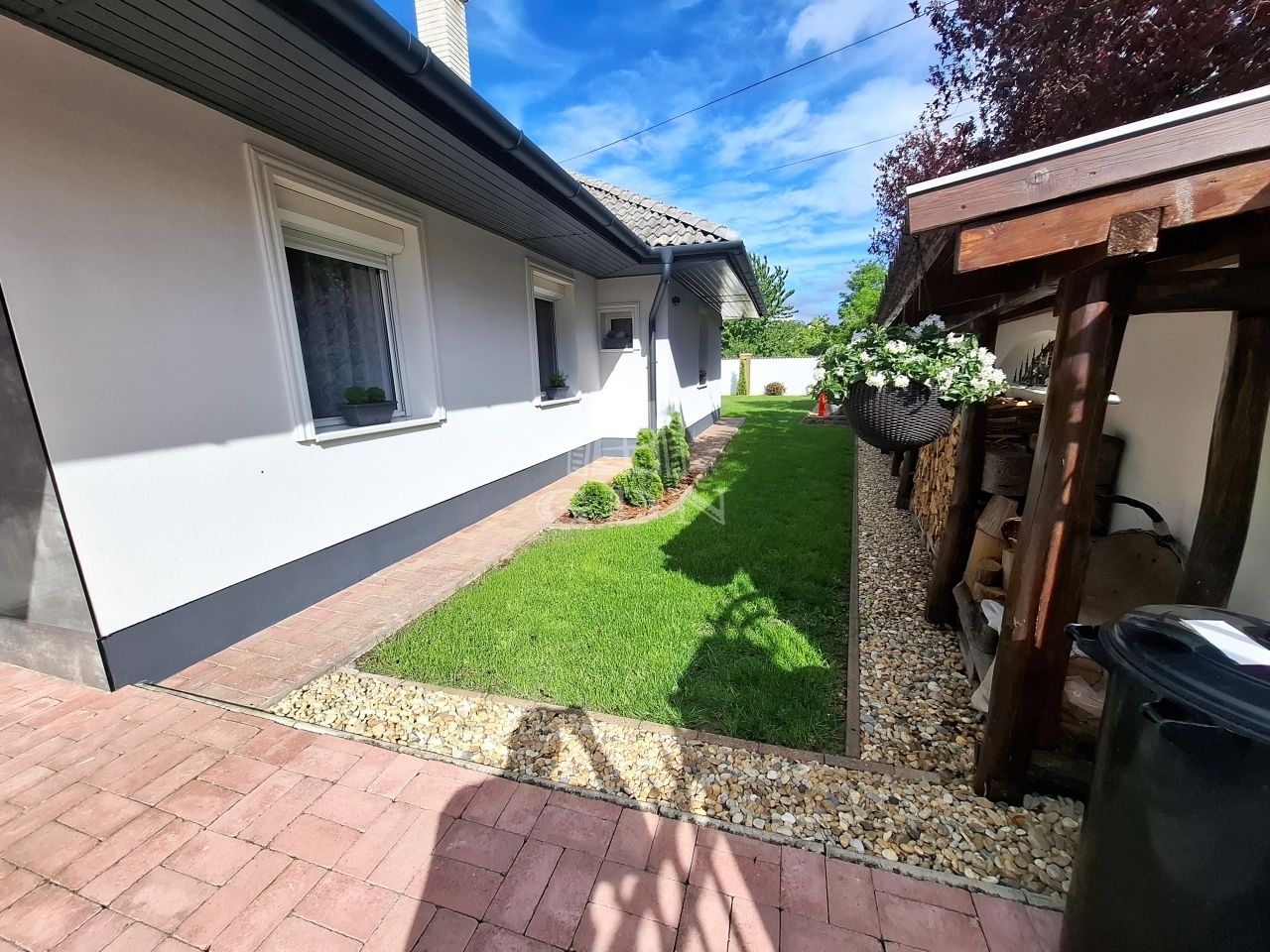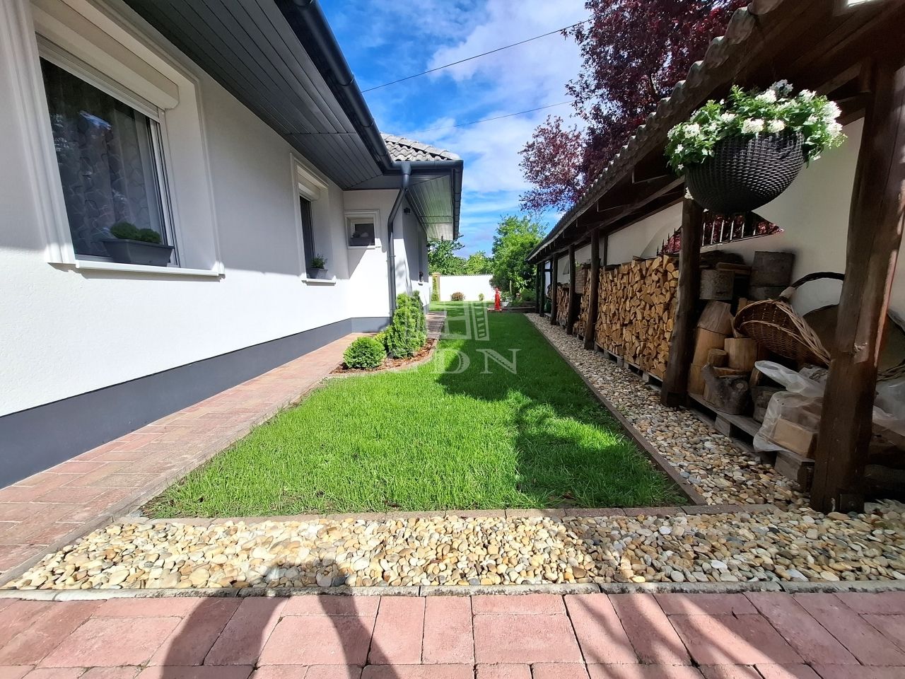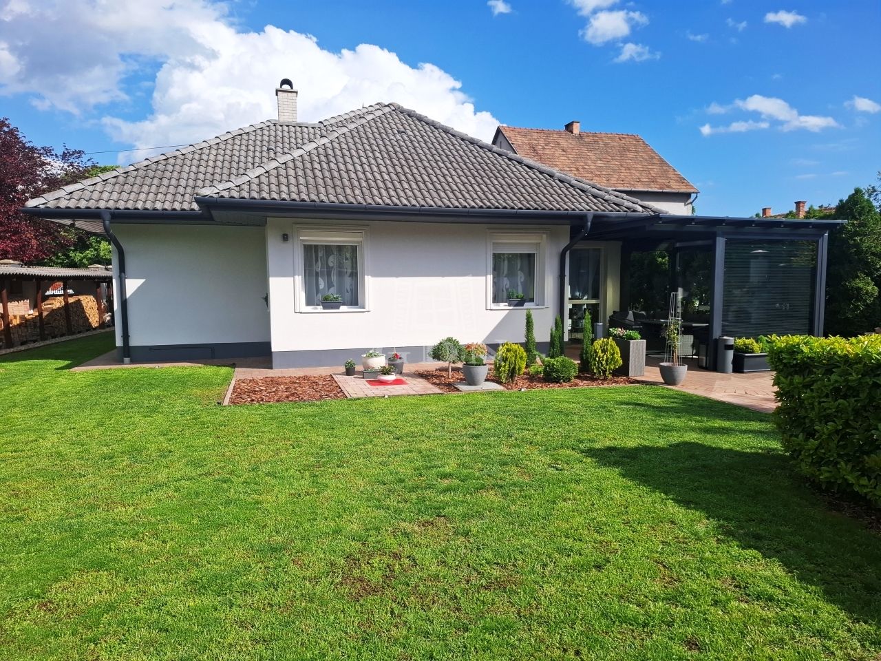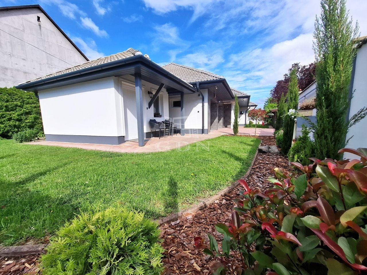-parkosított gondozott kert öntöző rendszerrel,örökzöldekkel,