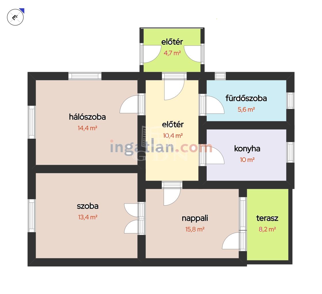 nappali 15,80m2, szoba 13,41m2, szoba 14,40m2, konyha 10m2, fürdőszoba 5,61m2, közlekedő-előtér 10,37m2, téli kert 4,7m2, 3,83m2, fedett terasz 8,19m2;