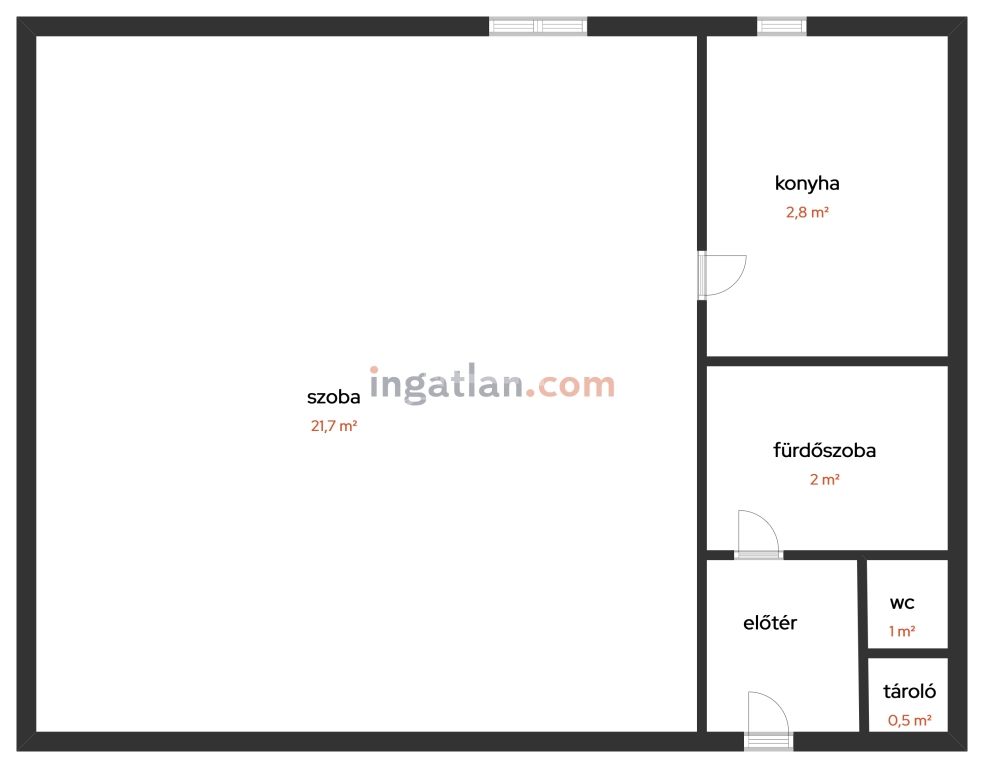 szoba 18,00m2, fürdőszoba 2,00m2, konyha-étkező-nappali 4,00m2, közlekedő-előtér 3,00m2, wc 1,00m2;